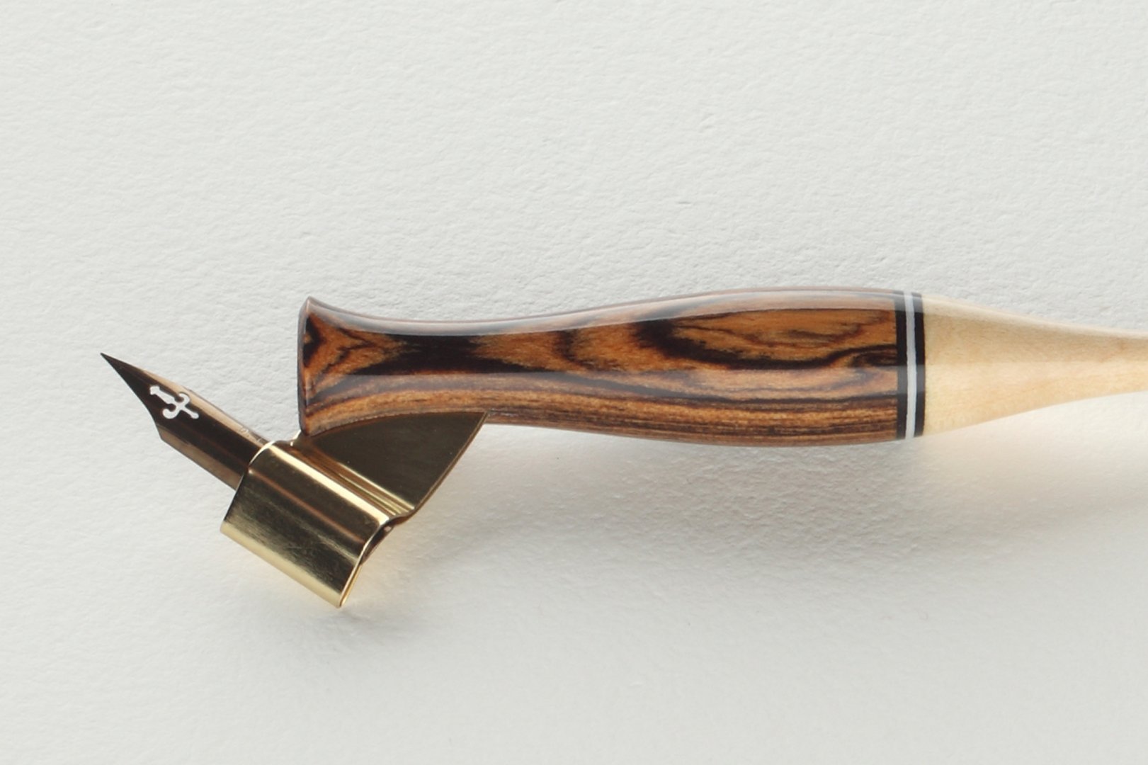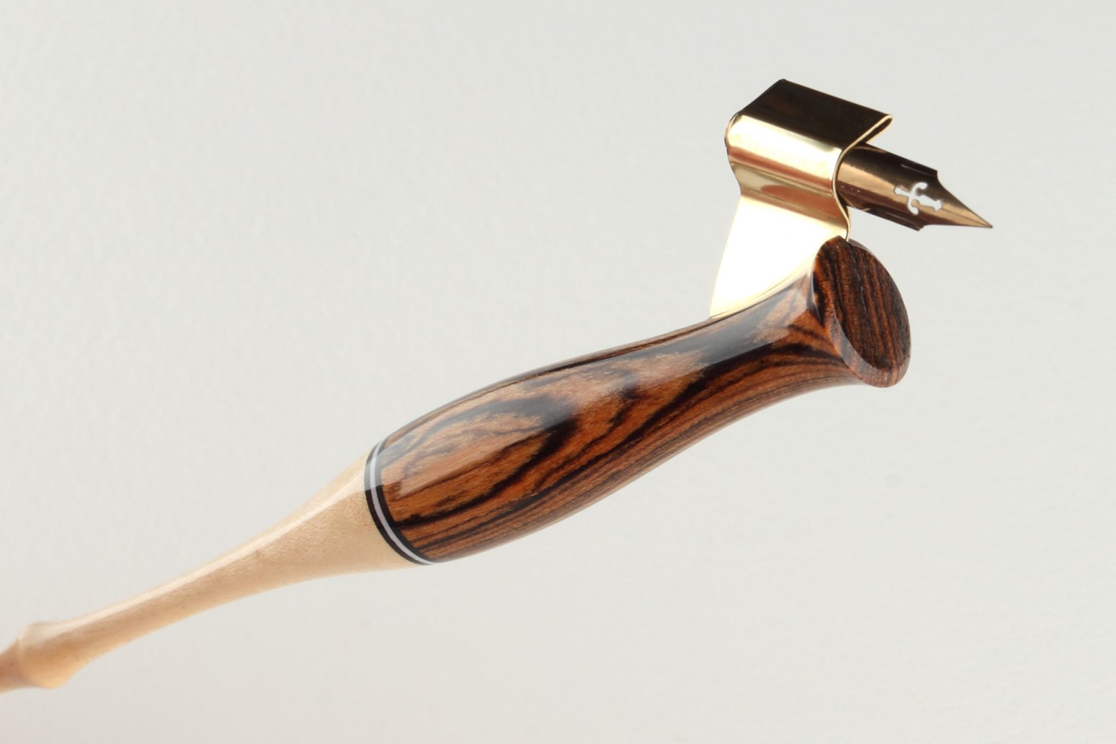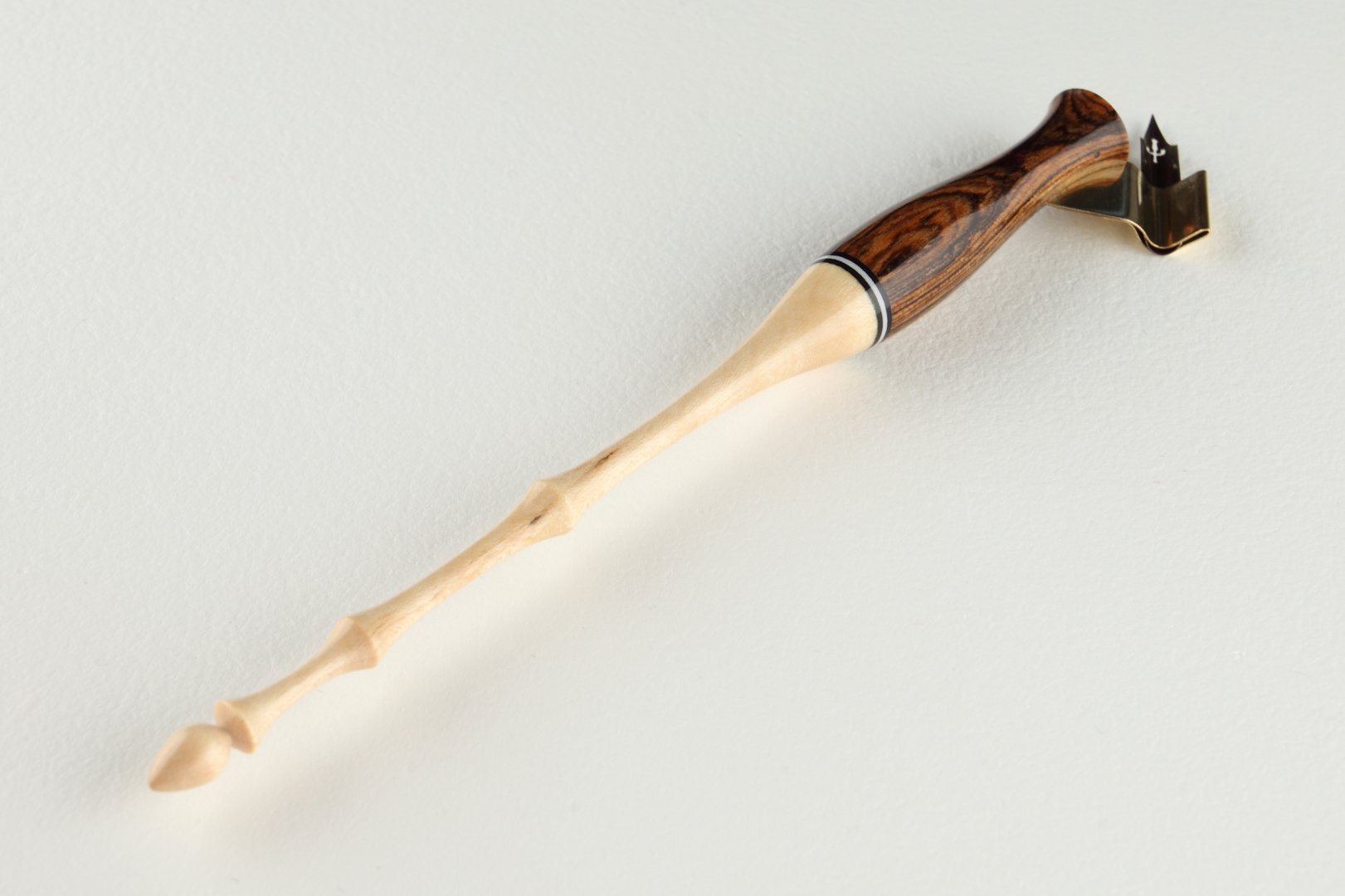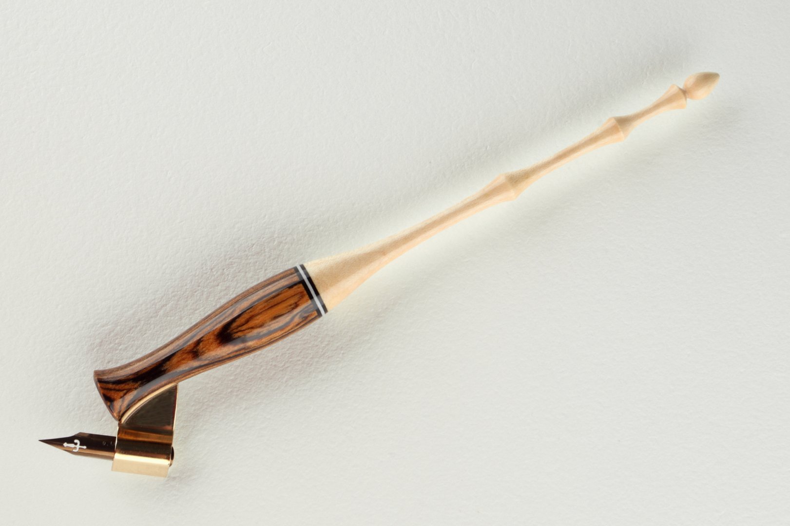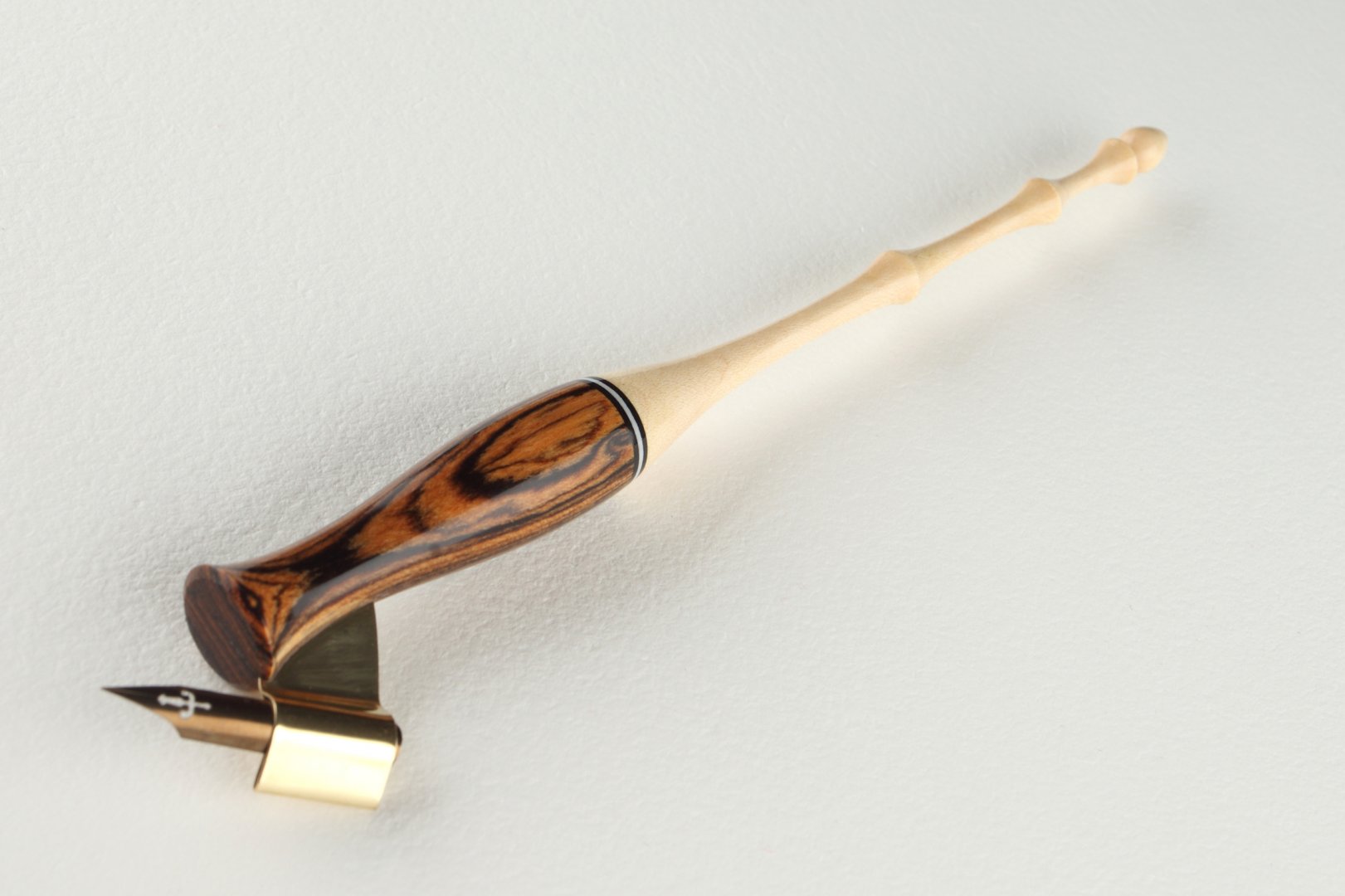 Pen holder made of bocote wood, 3 layers of compressed cellulose and curly maple wood.