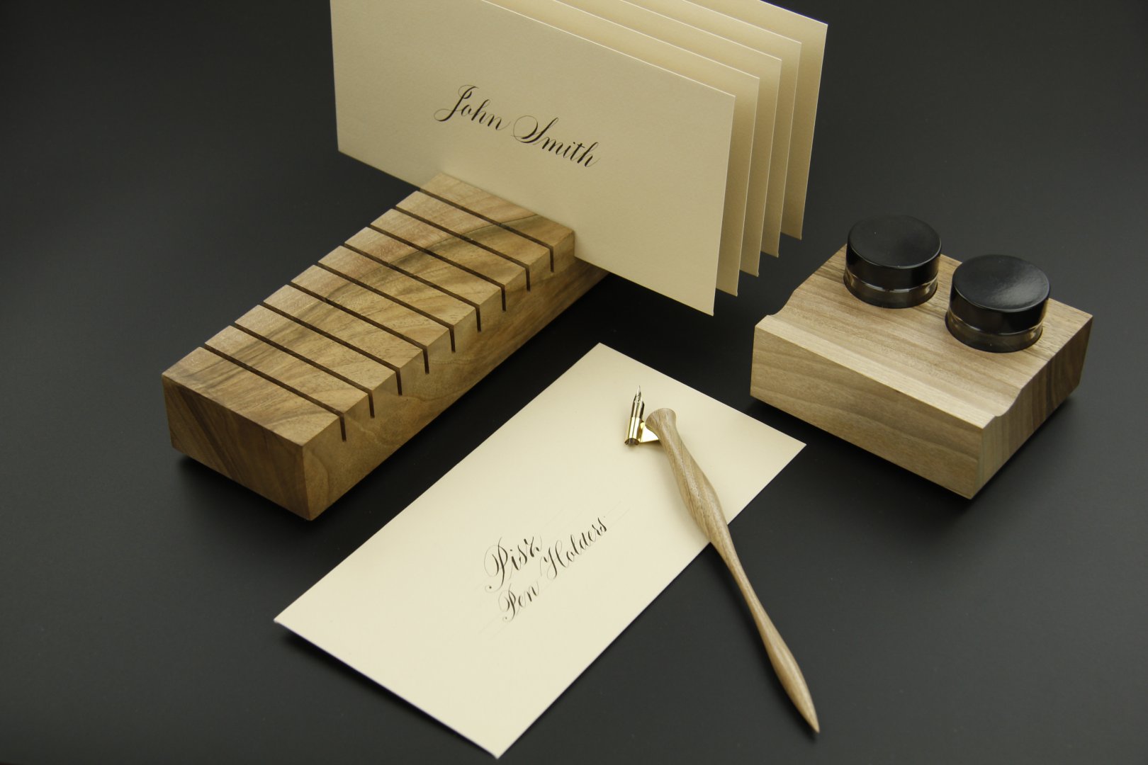 Drying rack for 20 envelopes, Wooden inkwell holder with two 30 ml jars, Oblique pen holder.
