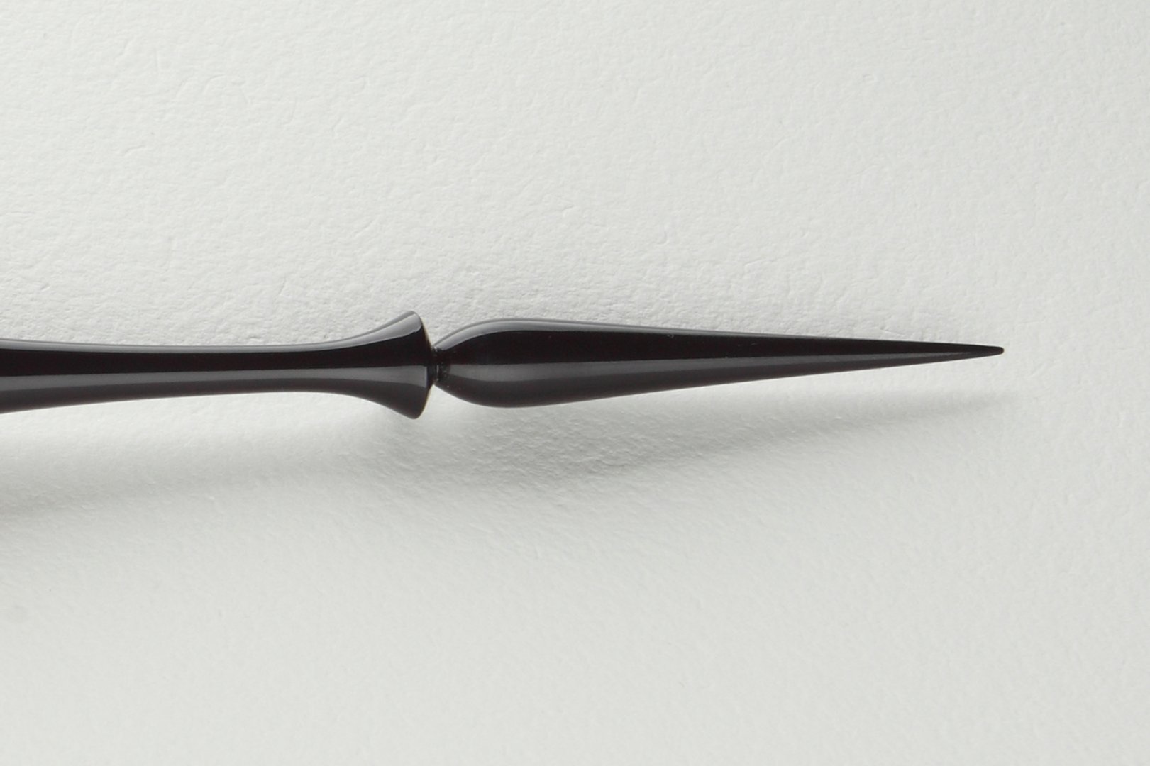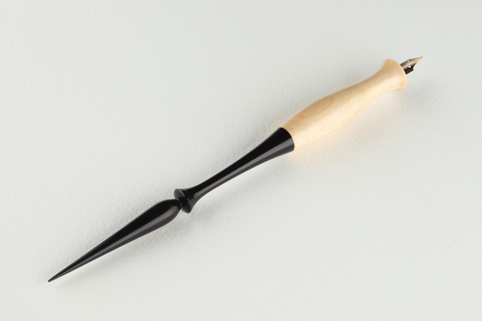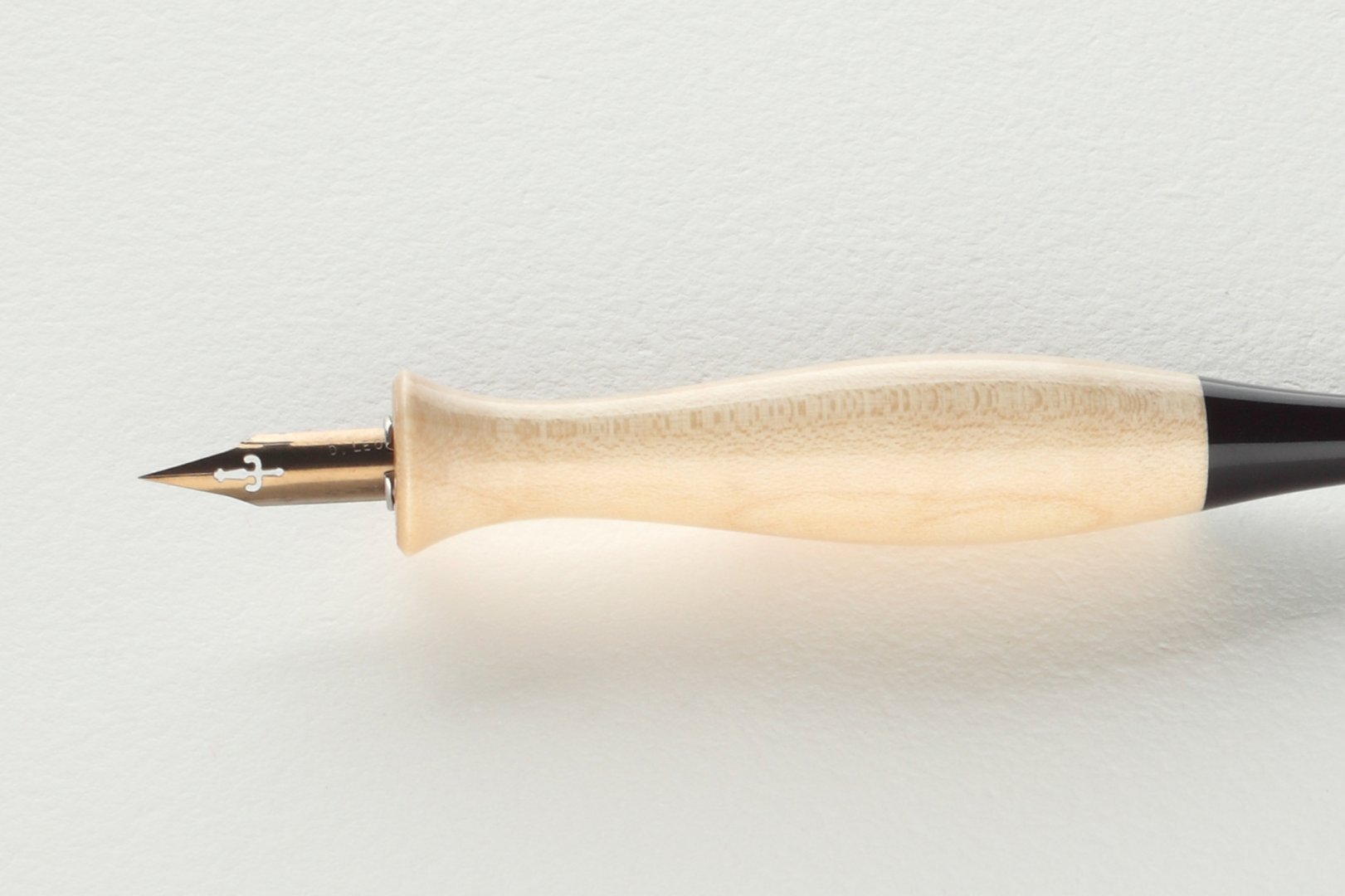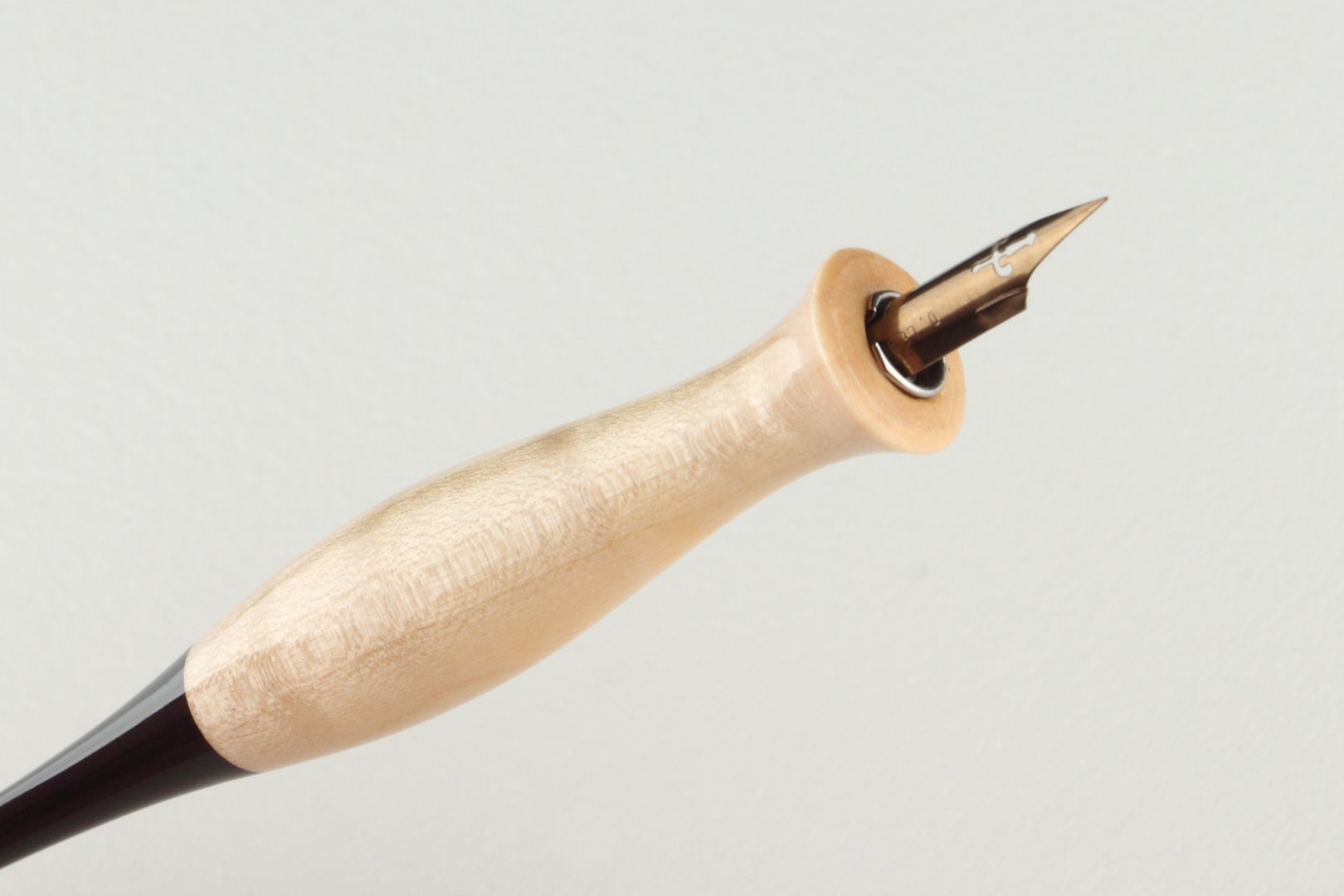 Pen holder made of gabon ebony and curly maple wood. Finished with gloss clear coat. Equipped with nib ferrule made of stainless steel.