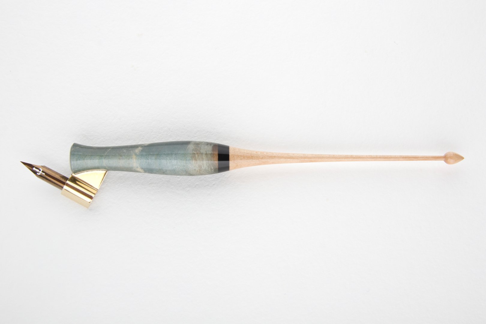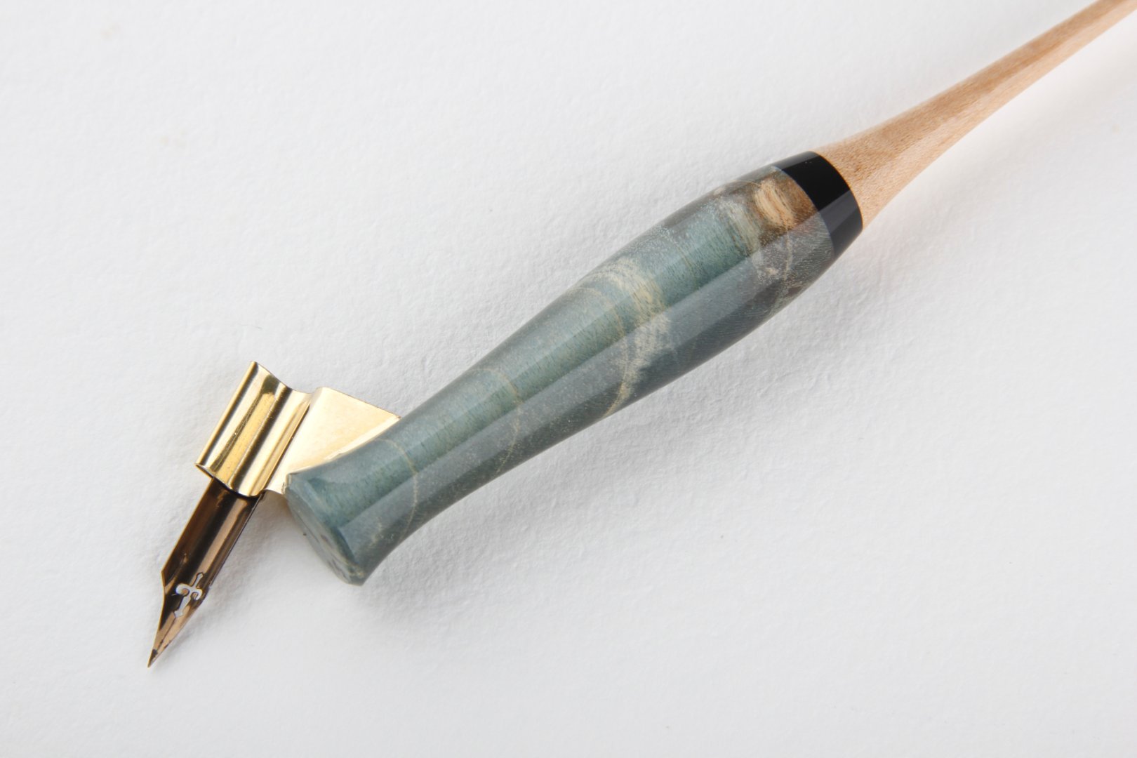 Oblique pen holder made of stabilized maple burl, african ebony and curly maple wood. Finished with 10 layers clear coat polished to a high gloss.