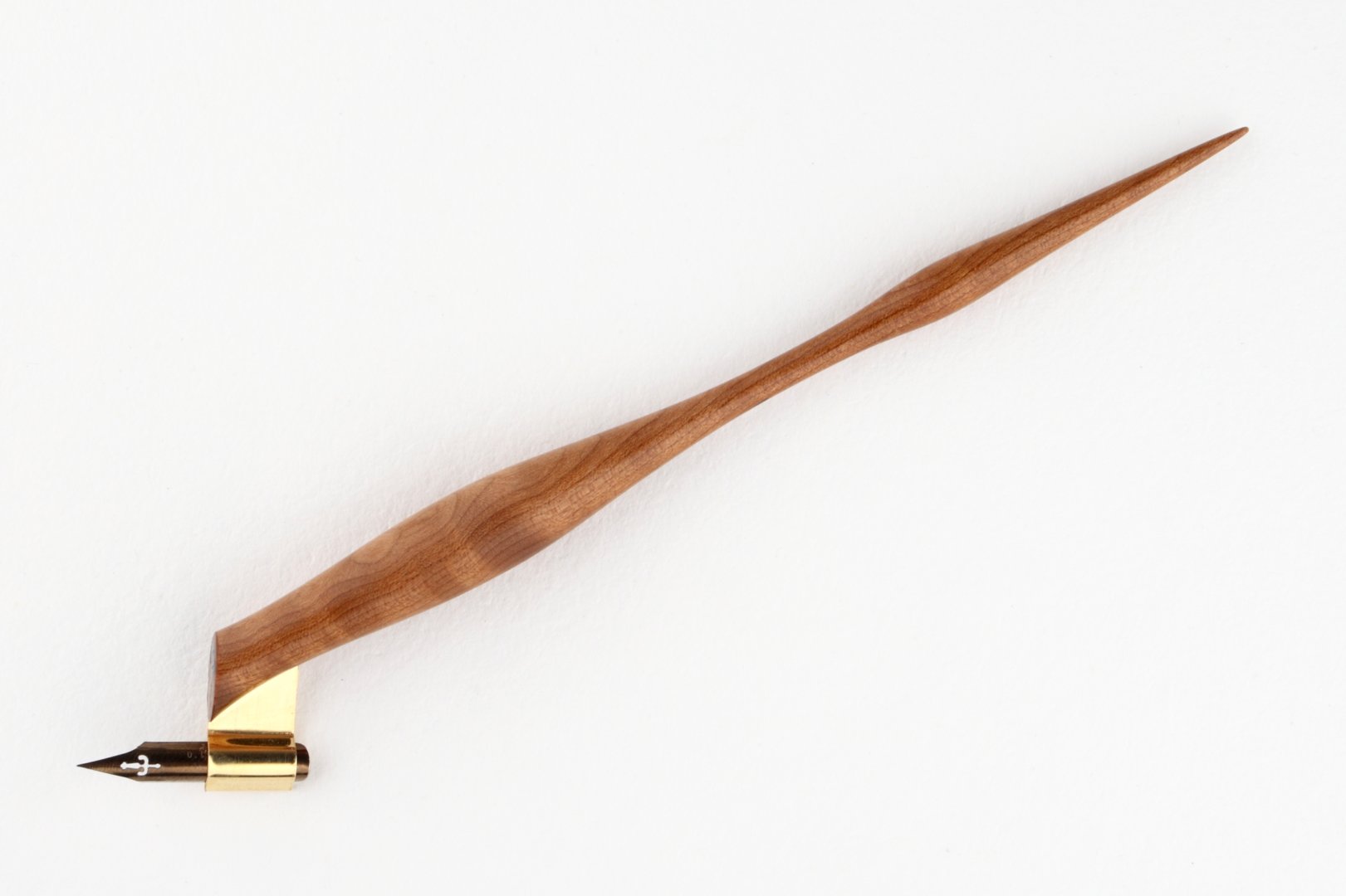 Oblique pen holder made of steamed curly american cherry and finished with natural wax.