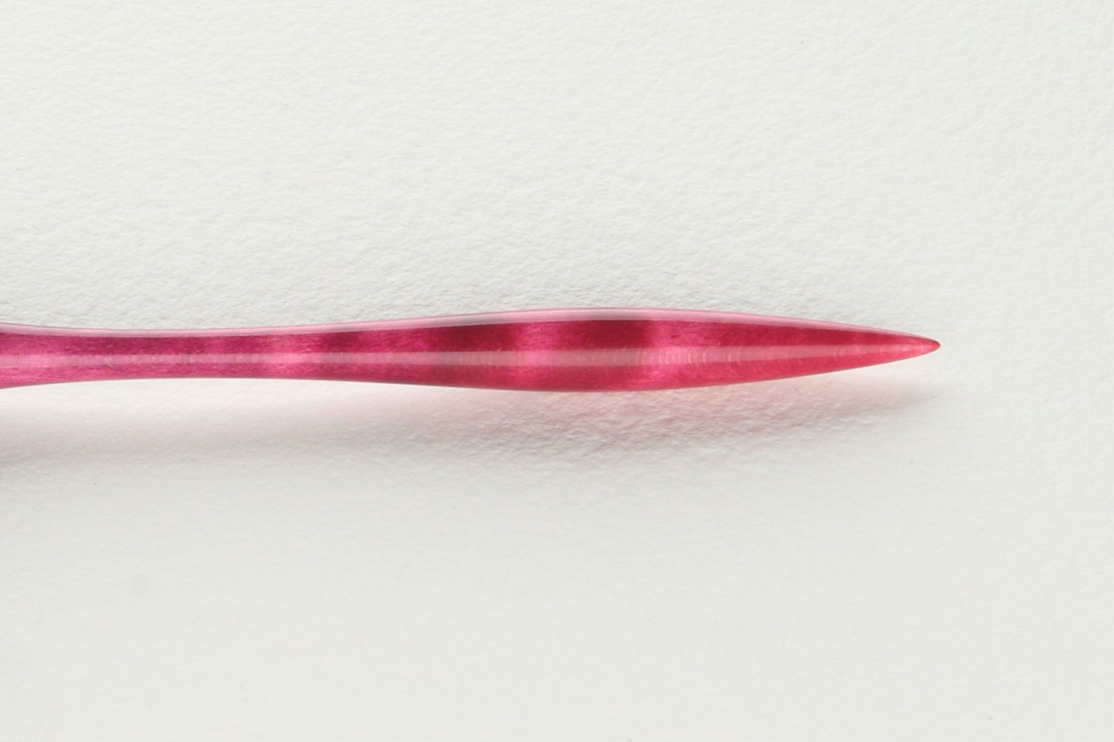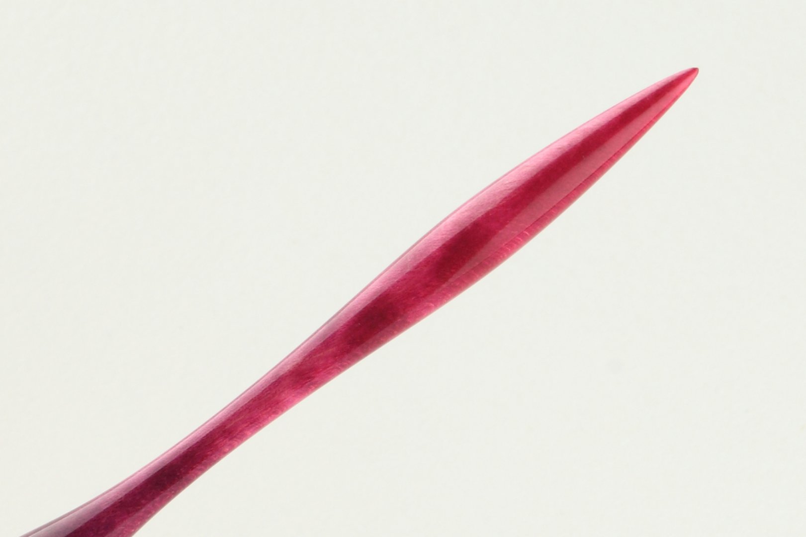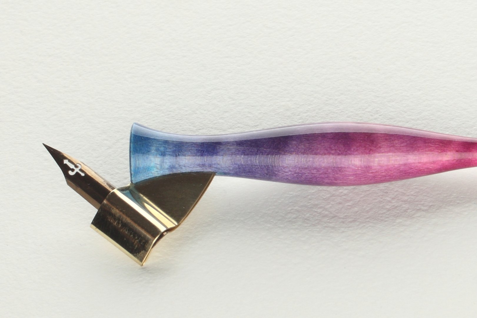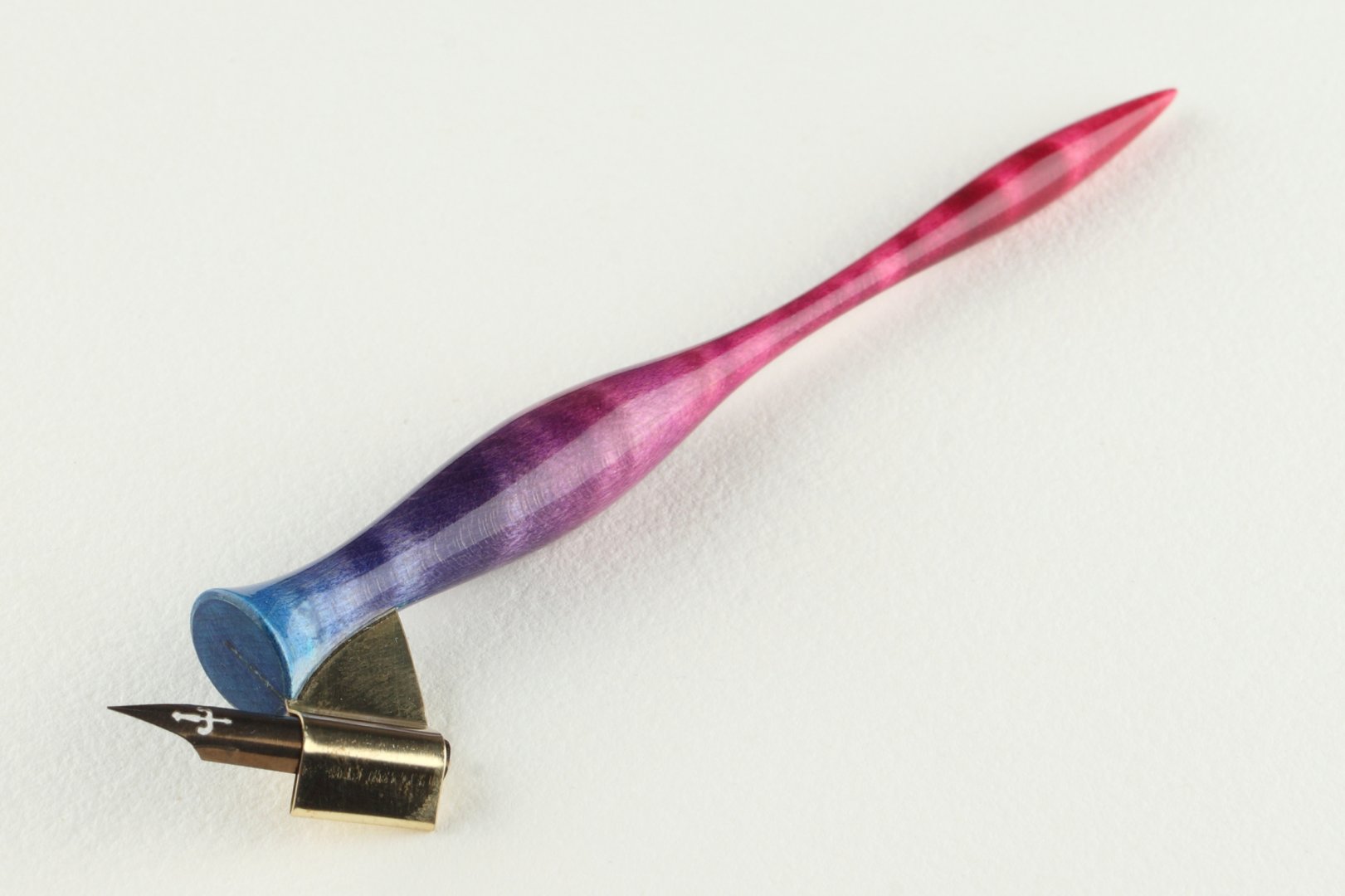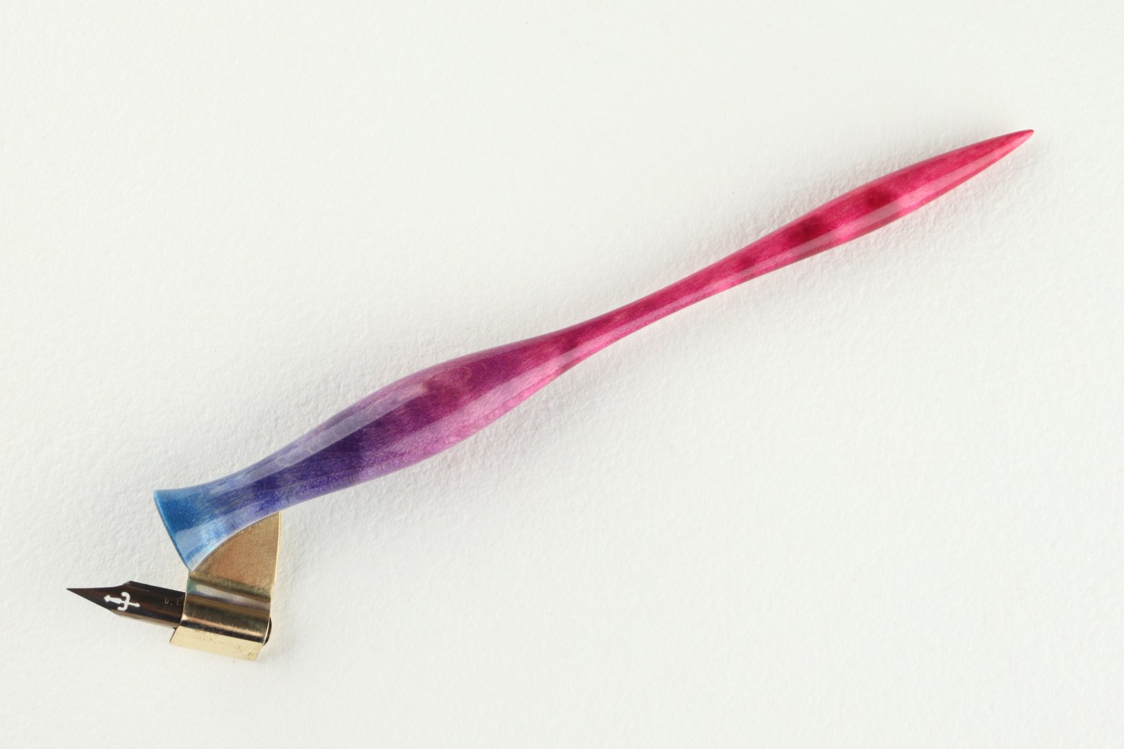 Pen holder made of dyed curly maple wood. Finished with gloss clear coat. Flange is made of brass.