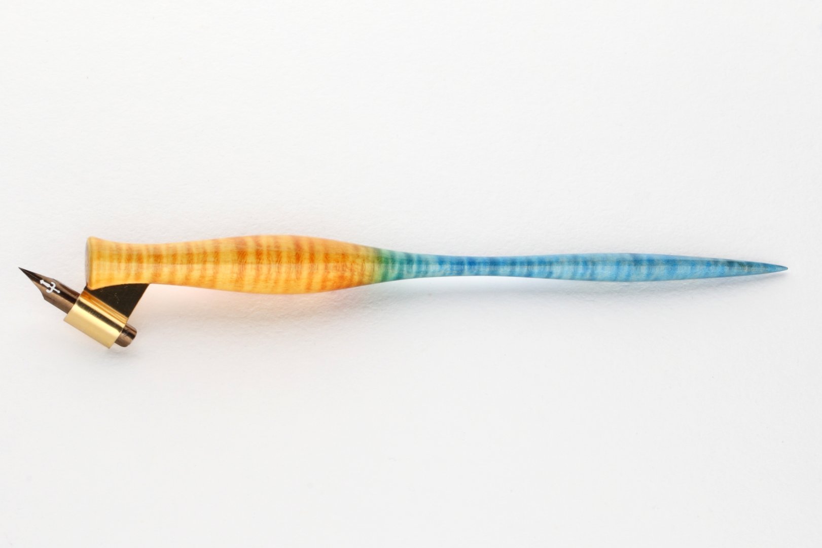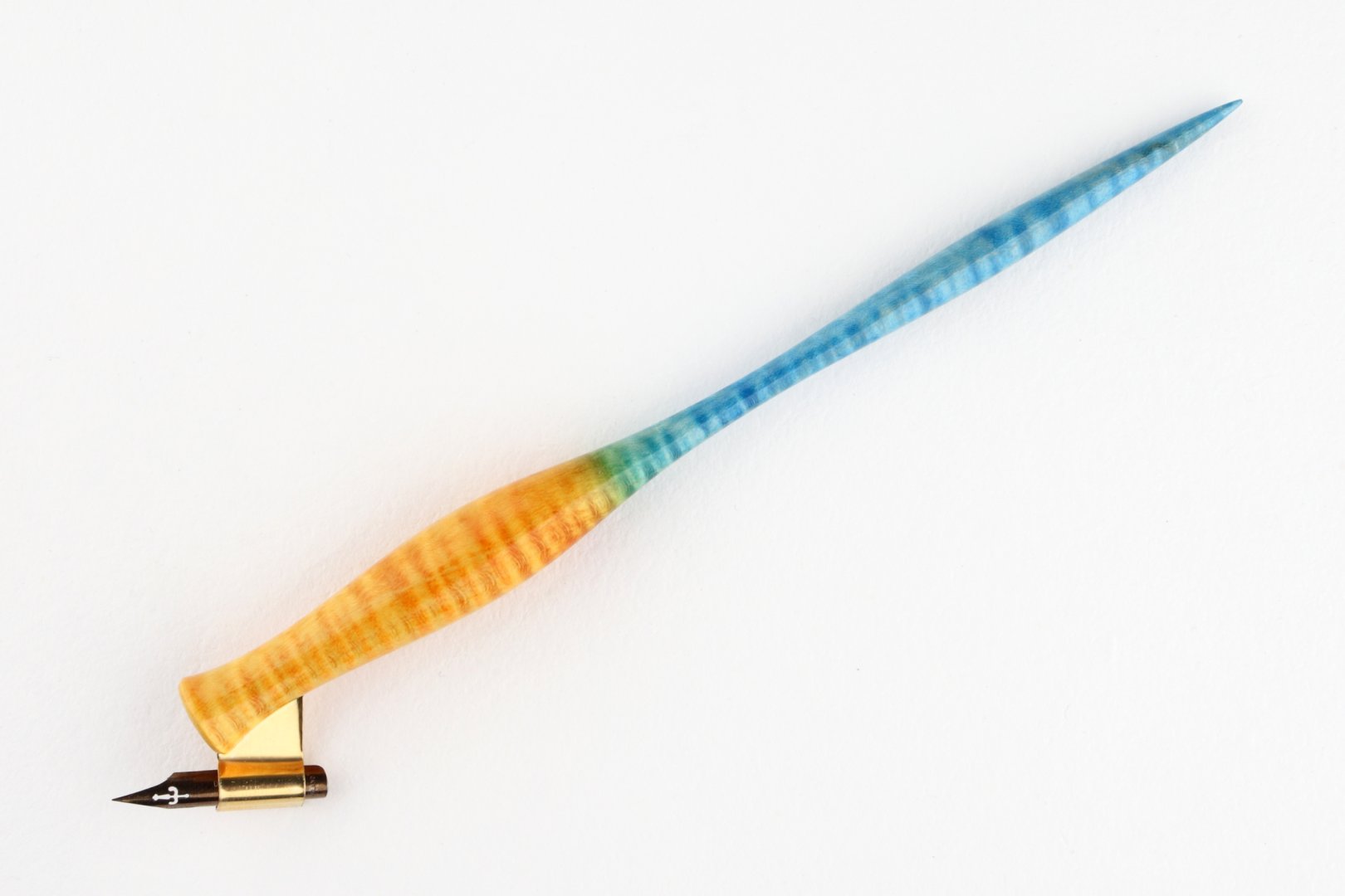 Pen holder made of dyed curly maple, finished with 10 layers clear coat polished to a high gloss.