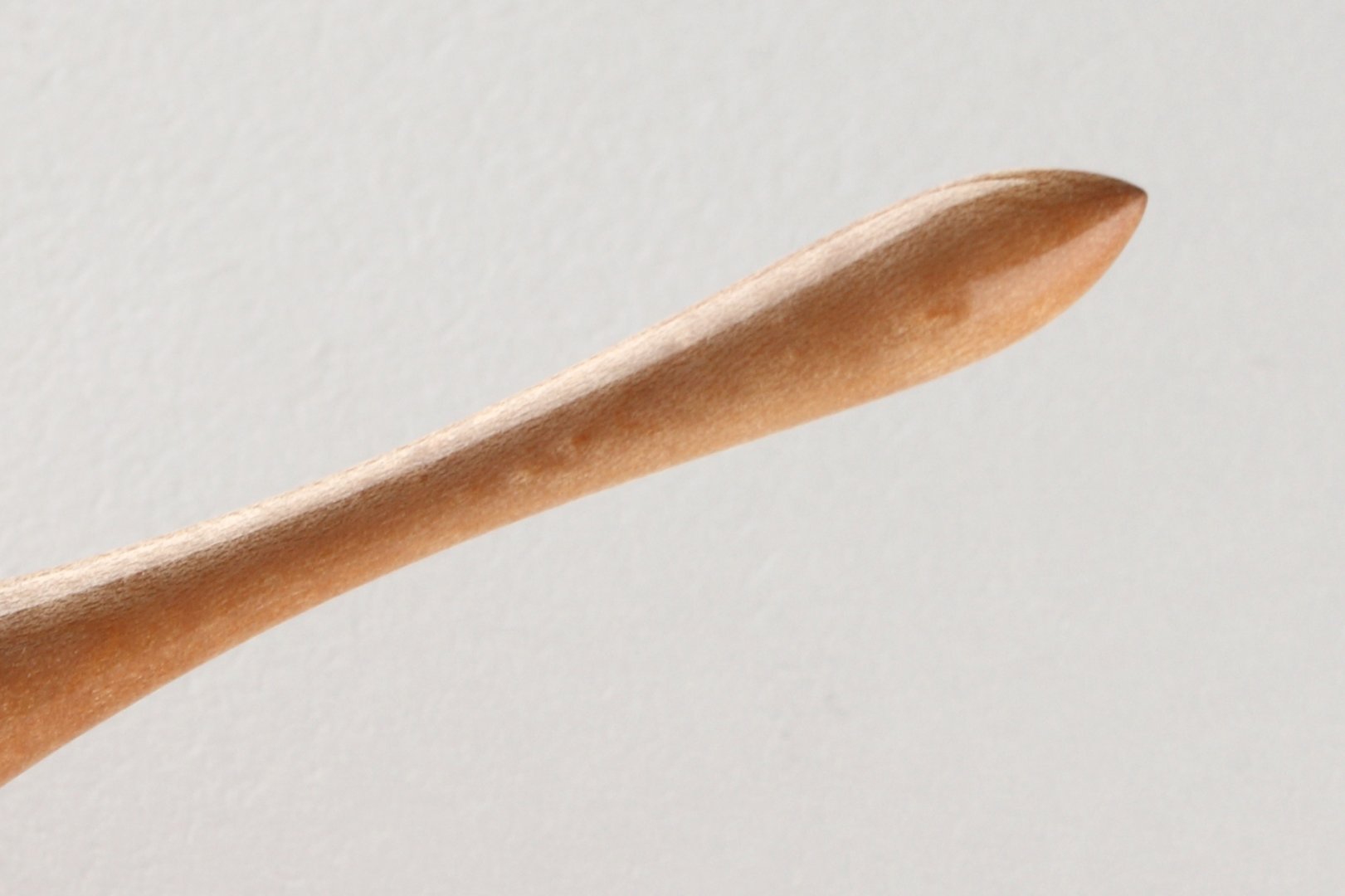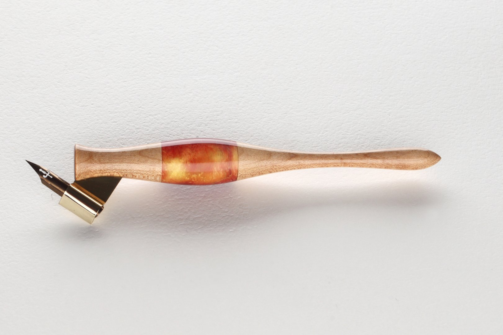 Pen holder made of stabilized birch burl and pear wood. Finished with gloss clear coat. Nib flange is made of brass.