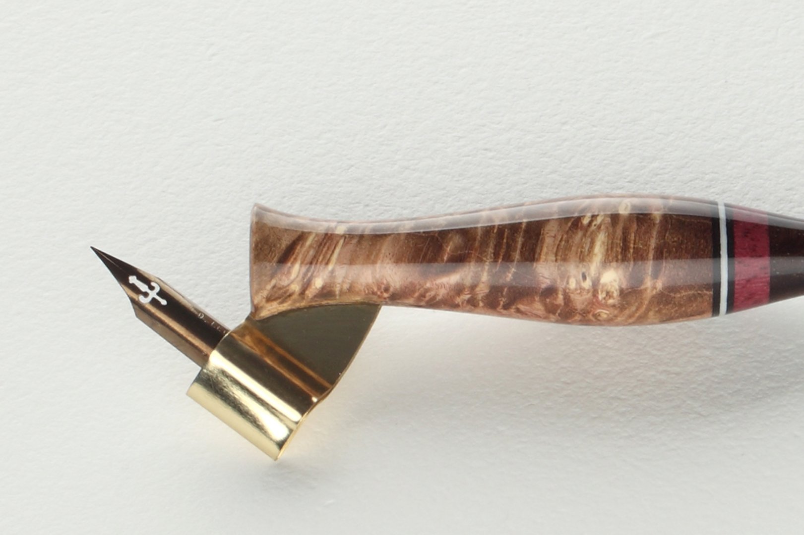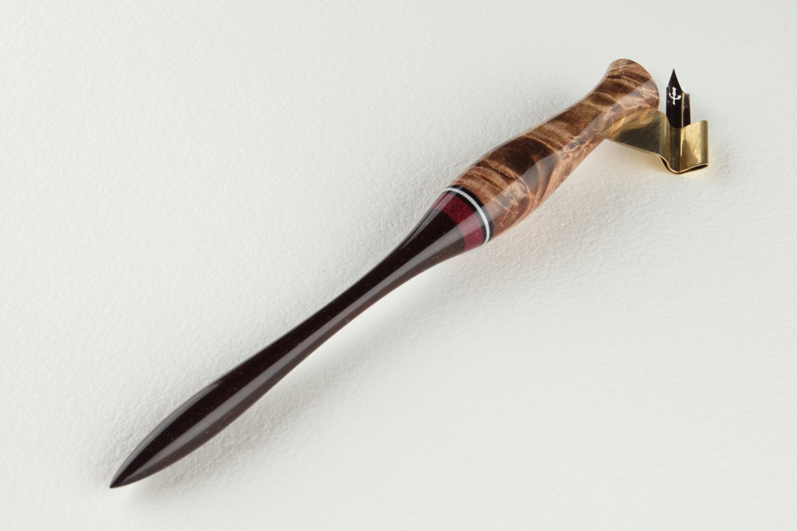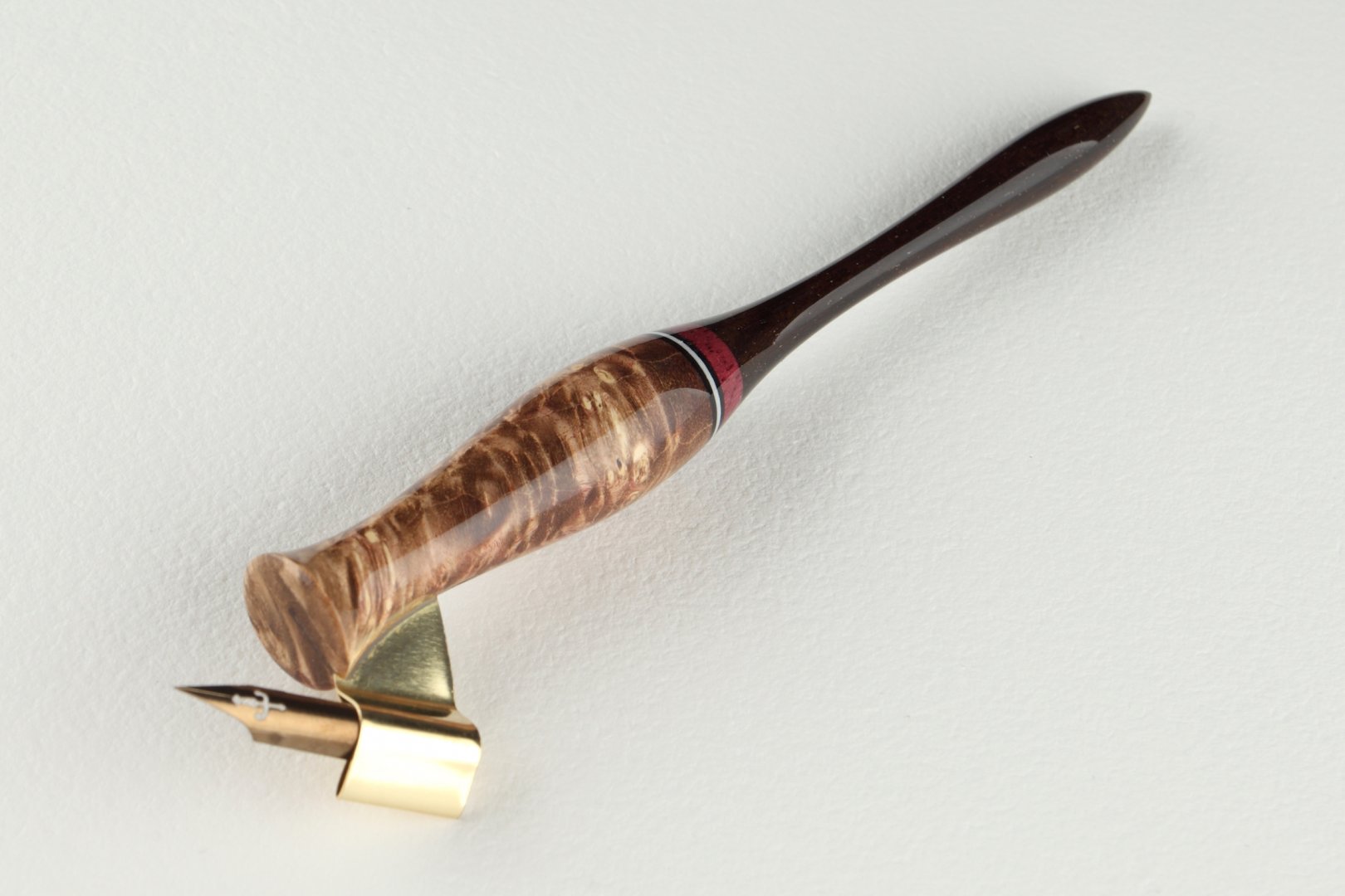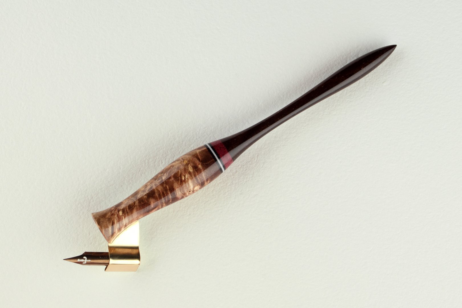 Pen holder made of stabilized burl of maple wood, 3 layers of compressed cellulose, amaranth wood and brazilian ebony wood.