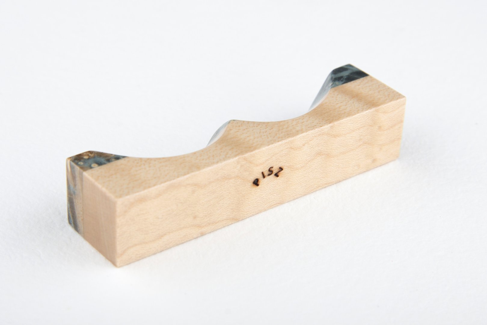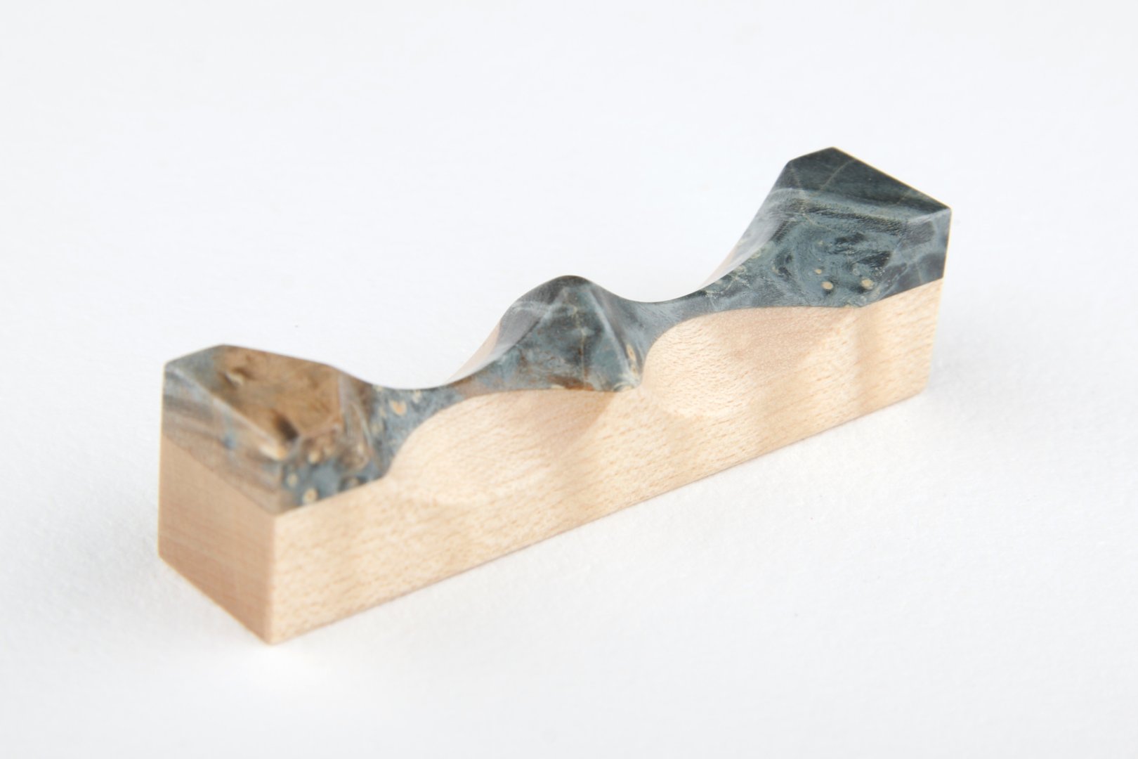 Pen rest made of stabilized maple burl and curly maple wood.