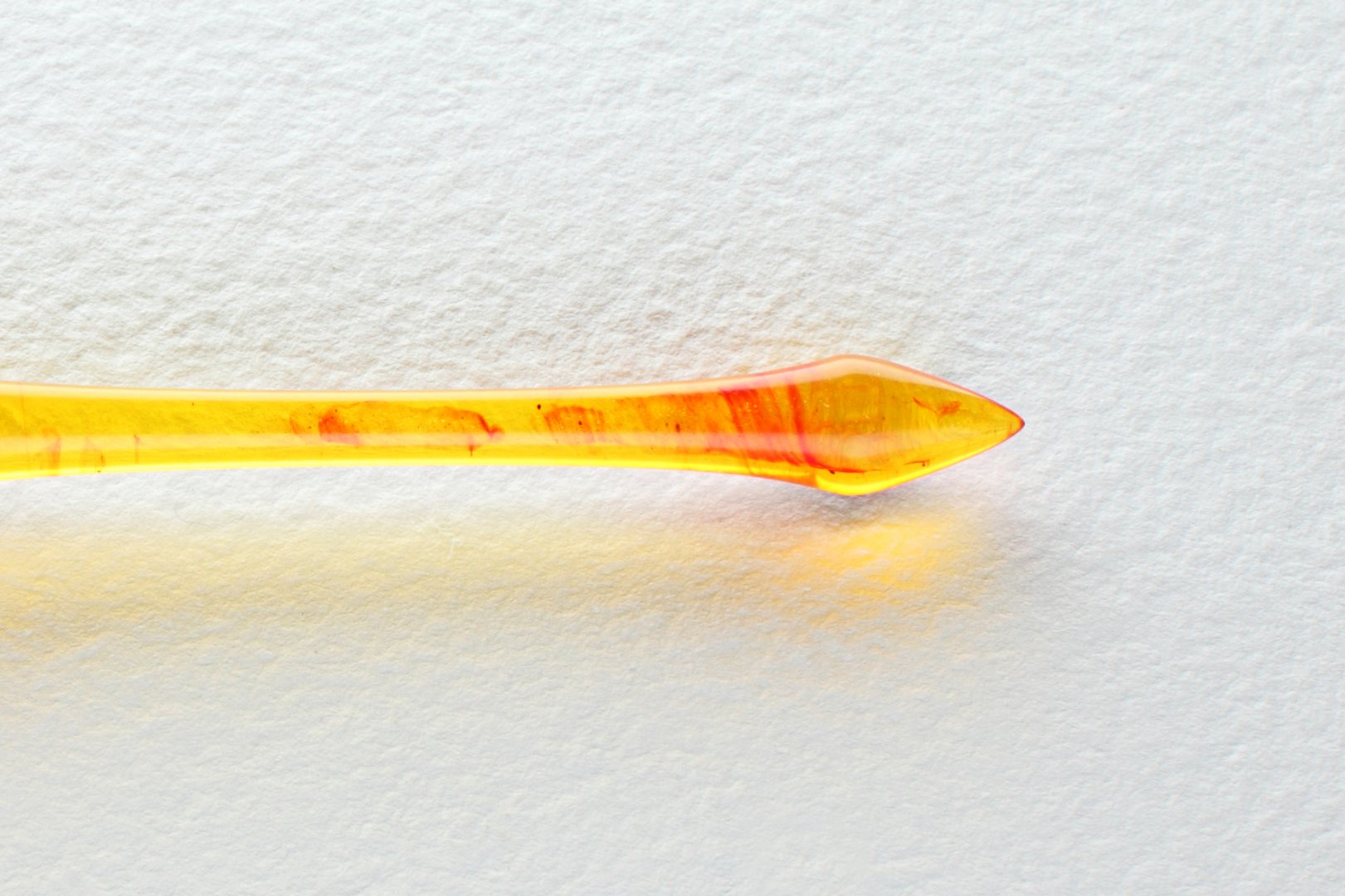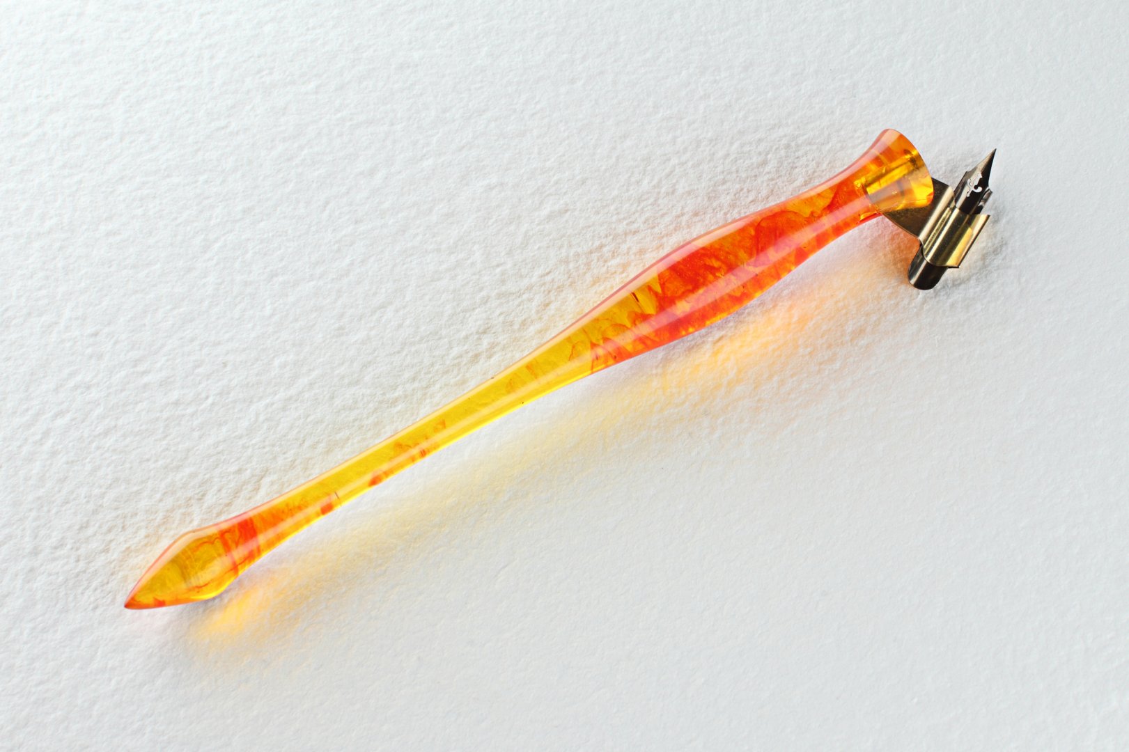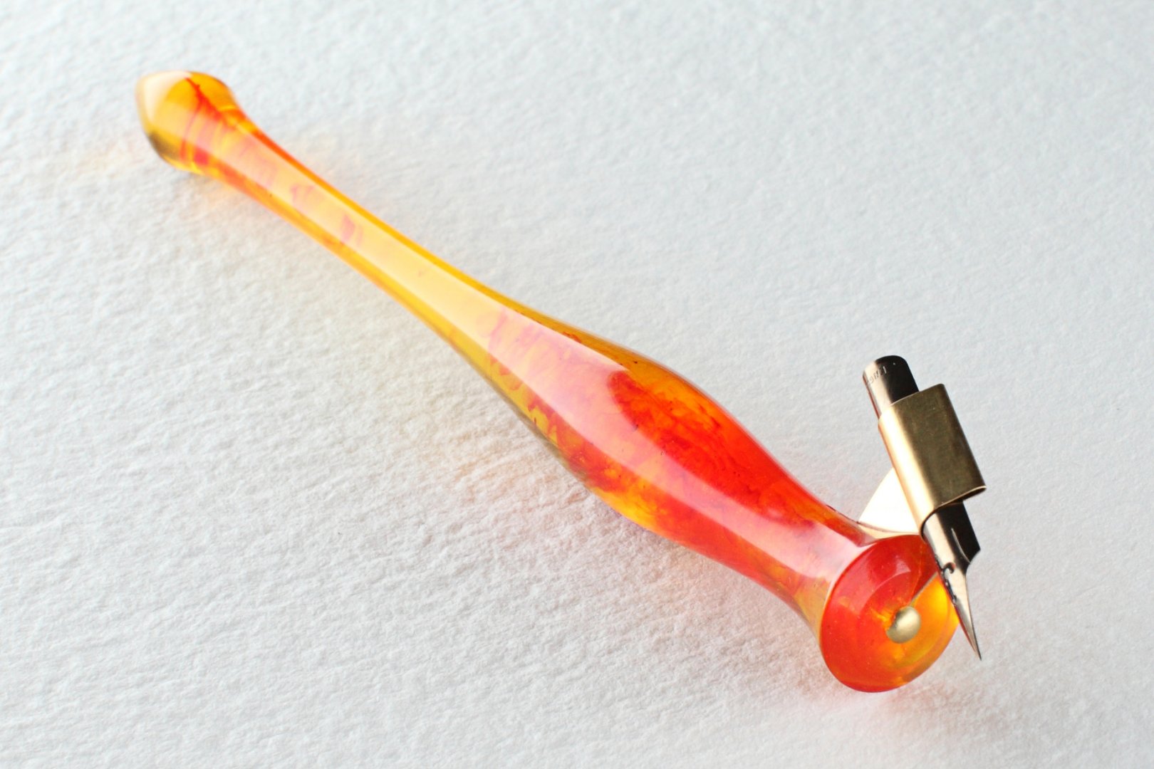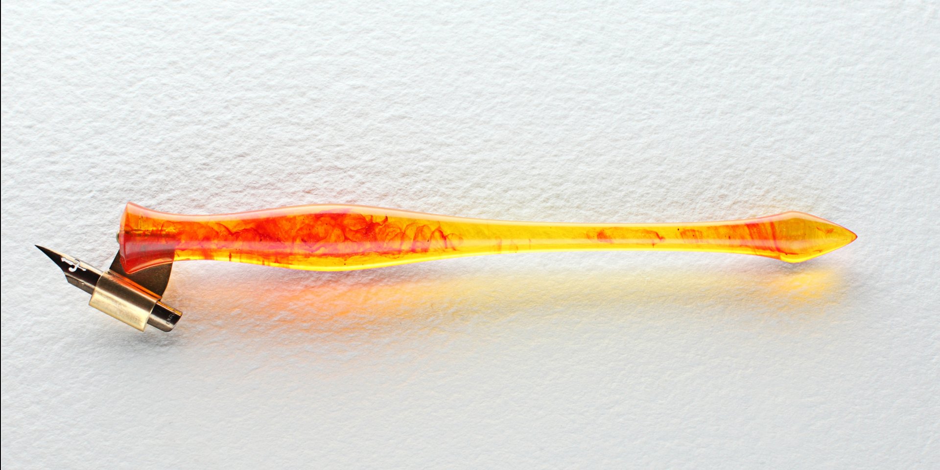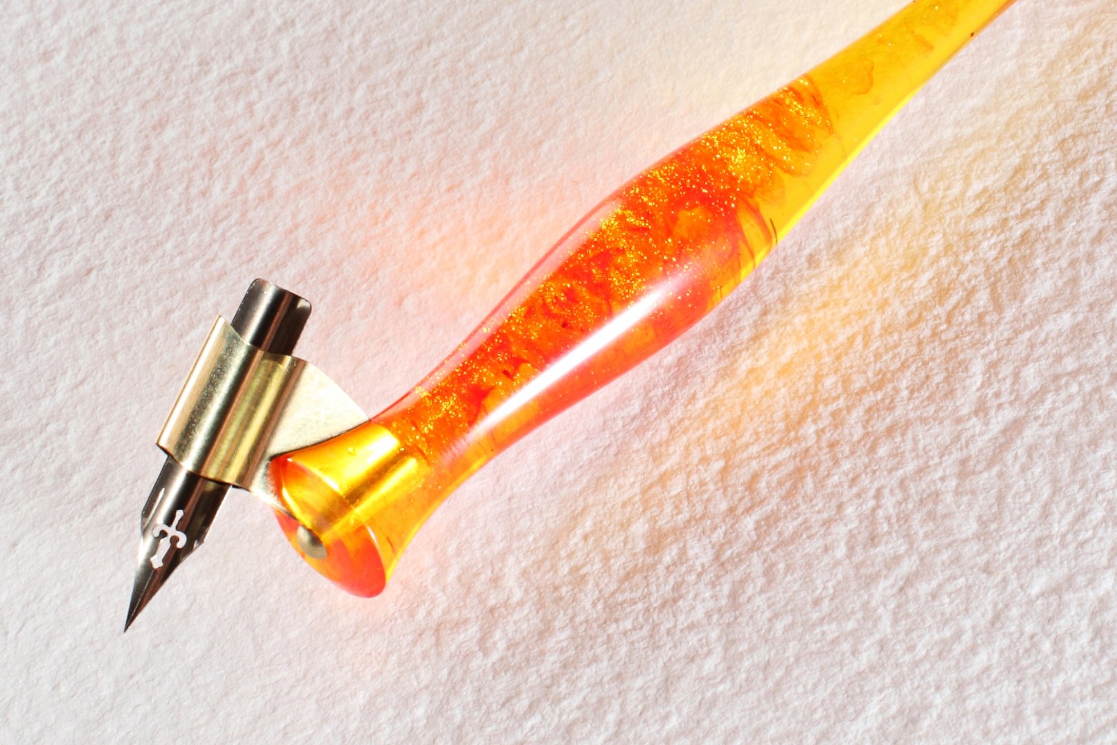 Pen holder made of the custom cast resin. Carefully polished to a high gloss. Amazing combination of yellow resin with red wisps and glinting particles, it makes gorgeous effect as you twirl the pen in the light. Nib flange is made of brass.