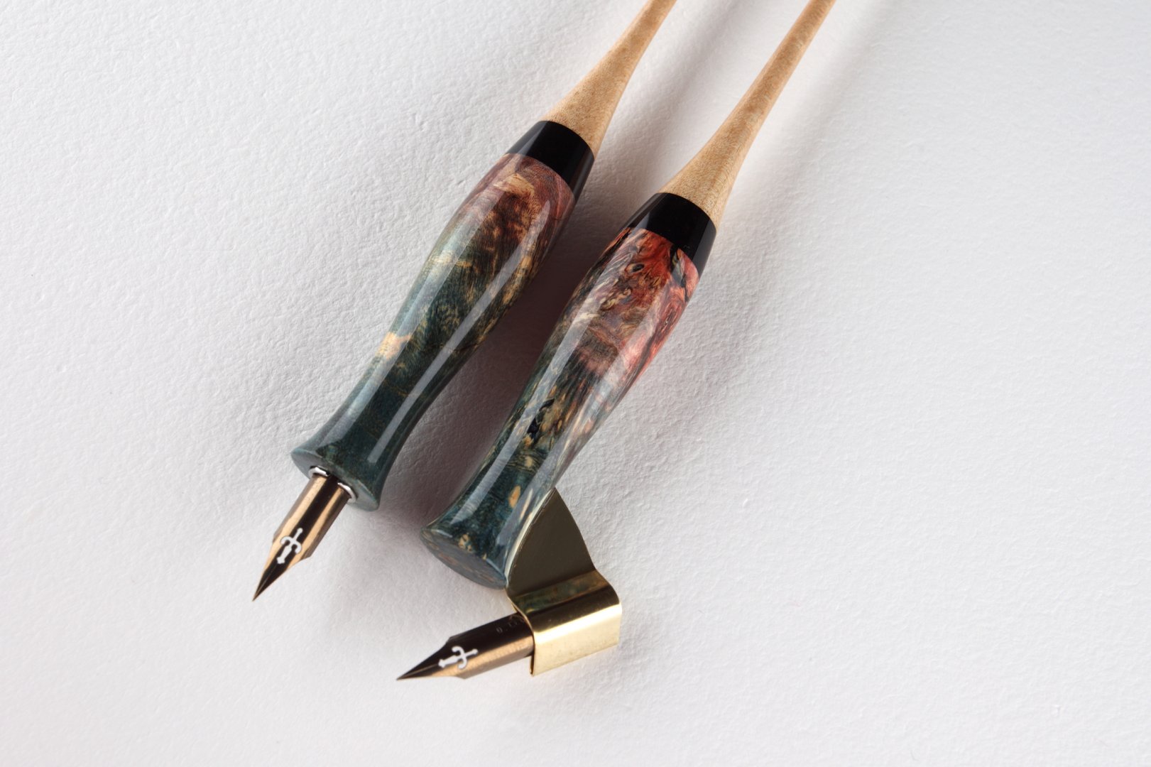 Set of pen holders made of stabilized maple burl and curly maple wood. Finished with gloss clear coat. Flange in oblique holder is made of brass, in straight one is made of stainless steel.