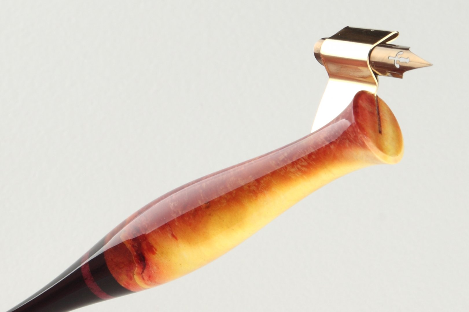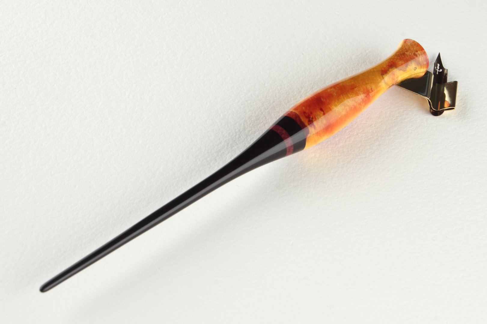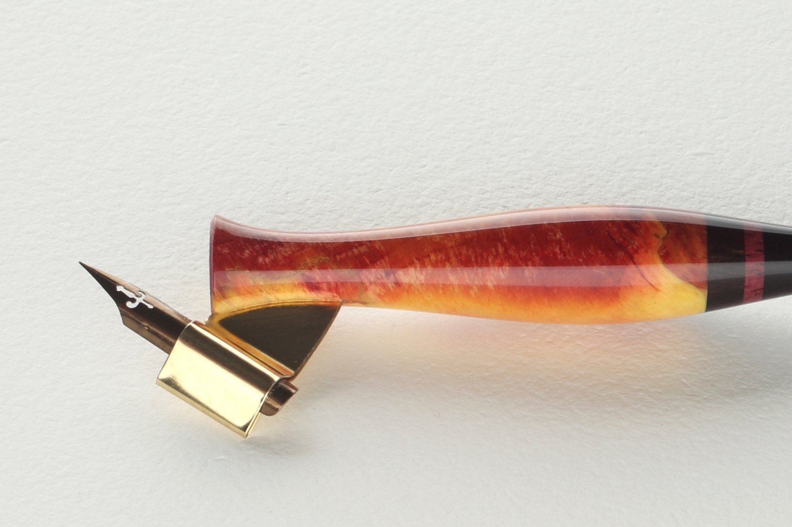 Pen holder made of stabilized burl of birch wood, amaranth wood and african ebony wood.