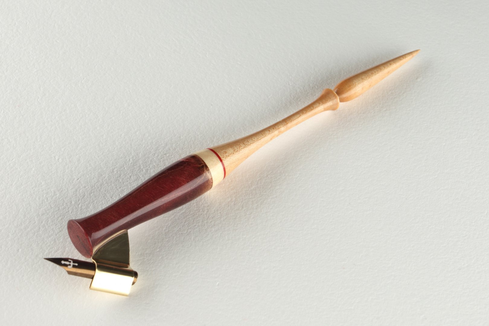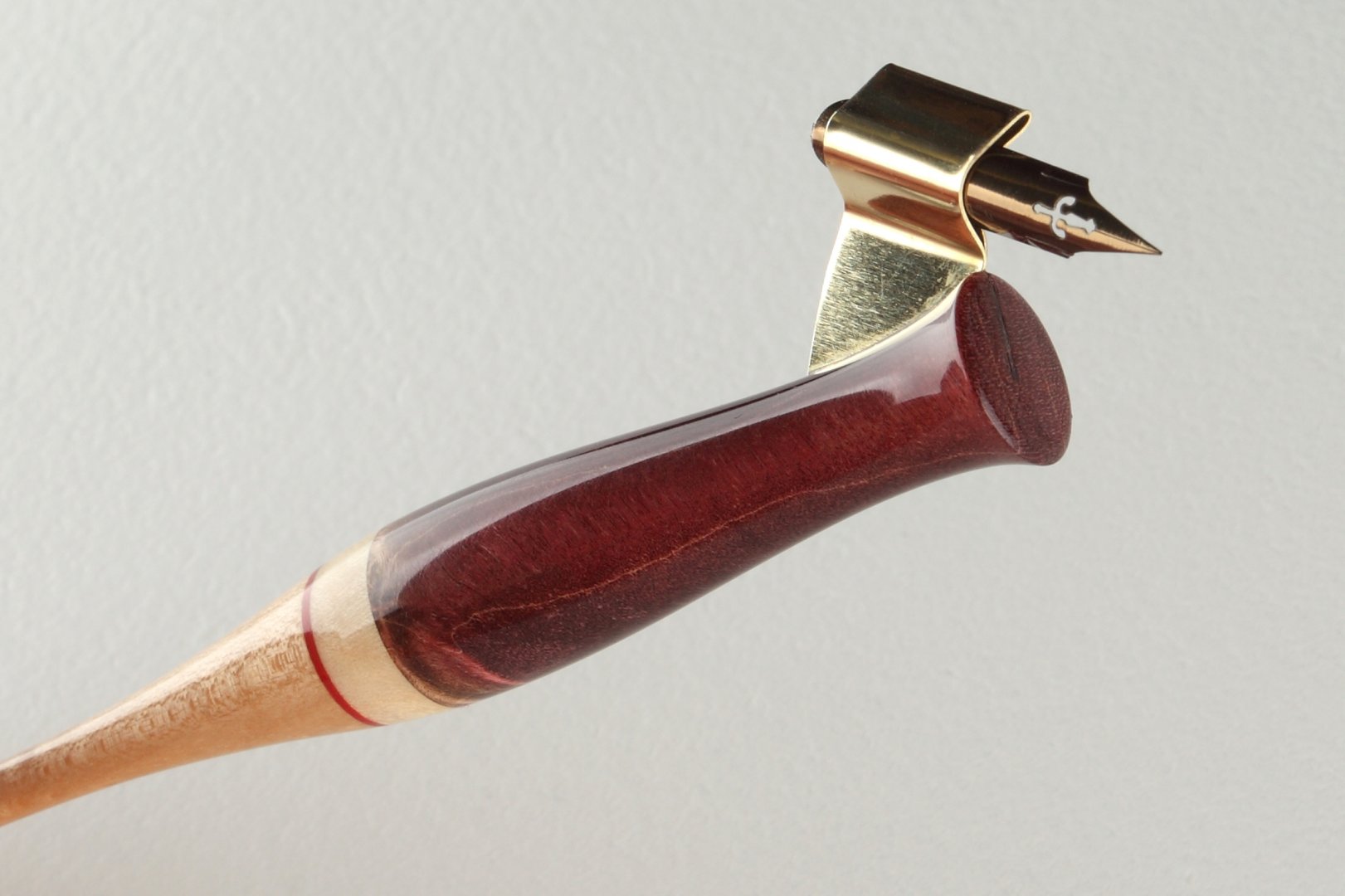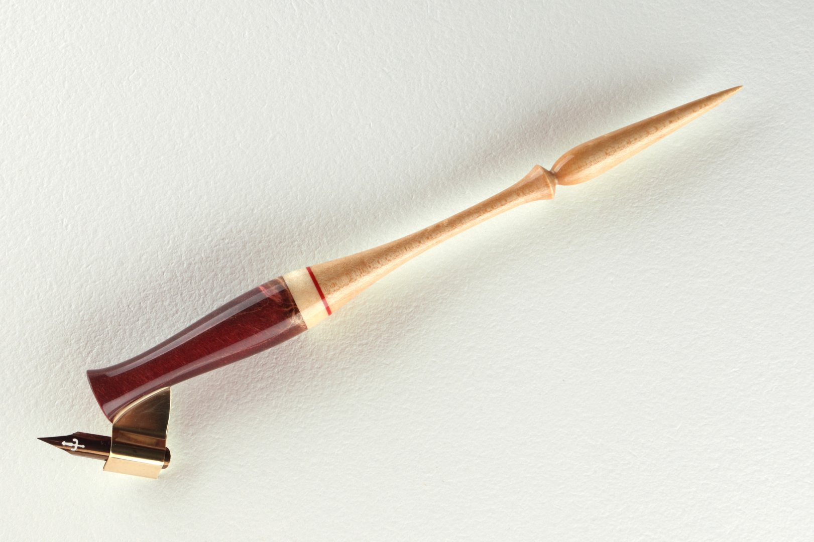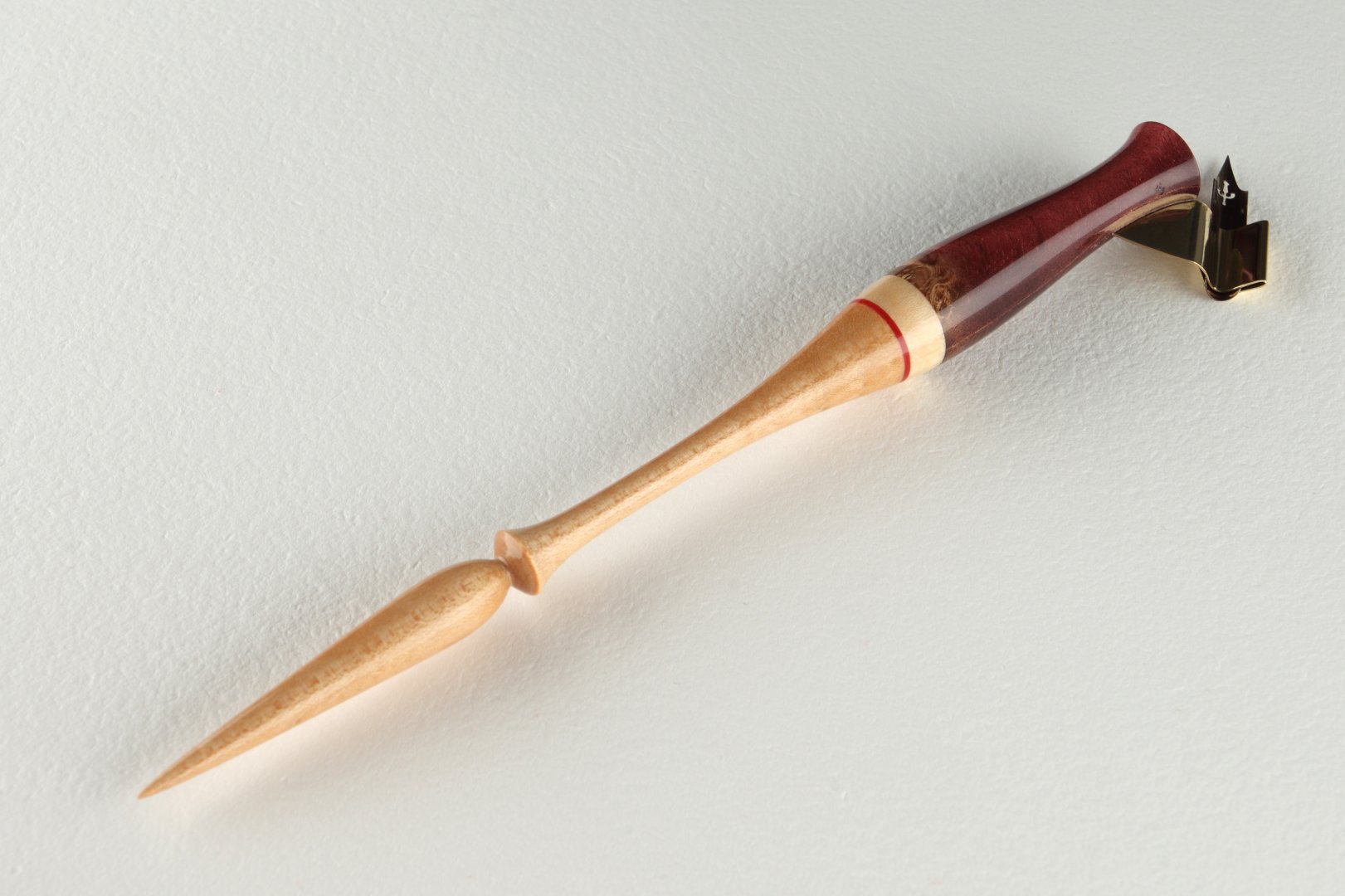 Pen holder made of stabilized burl of maple wood, curly maple wood and compressed cellulose inset.