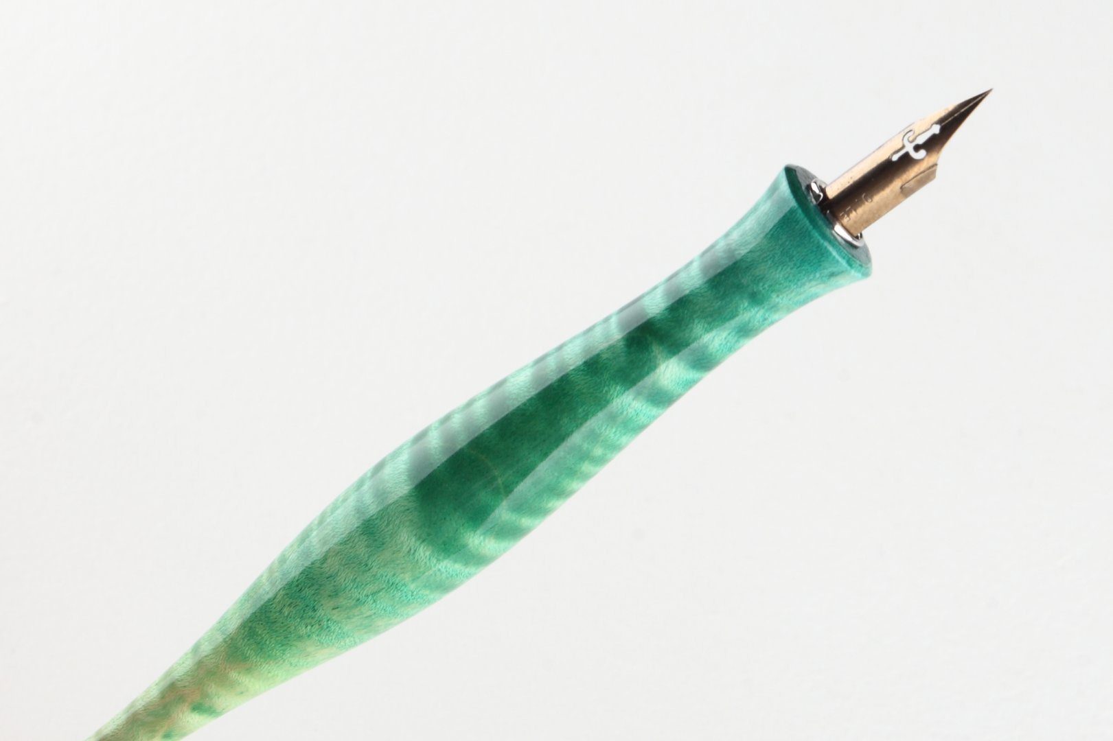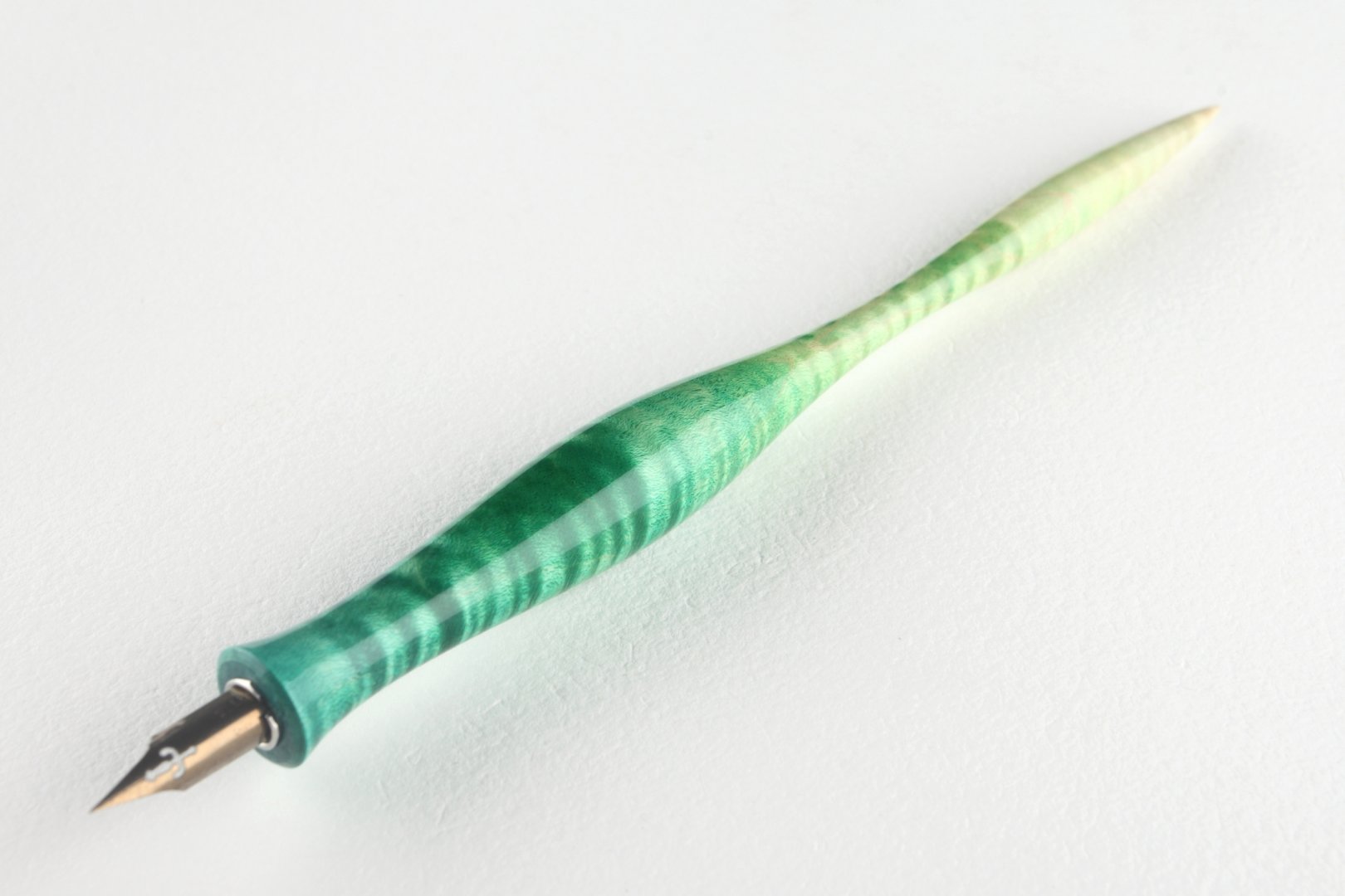 Straight pen holder made of dyed curly maple, finished with 10 layers clear coat polished to a high gloss. Equipped with a stainless steel ferrule.