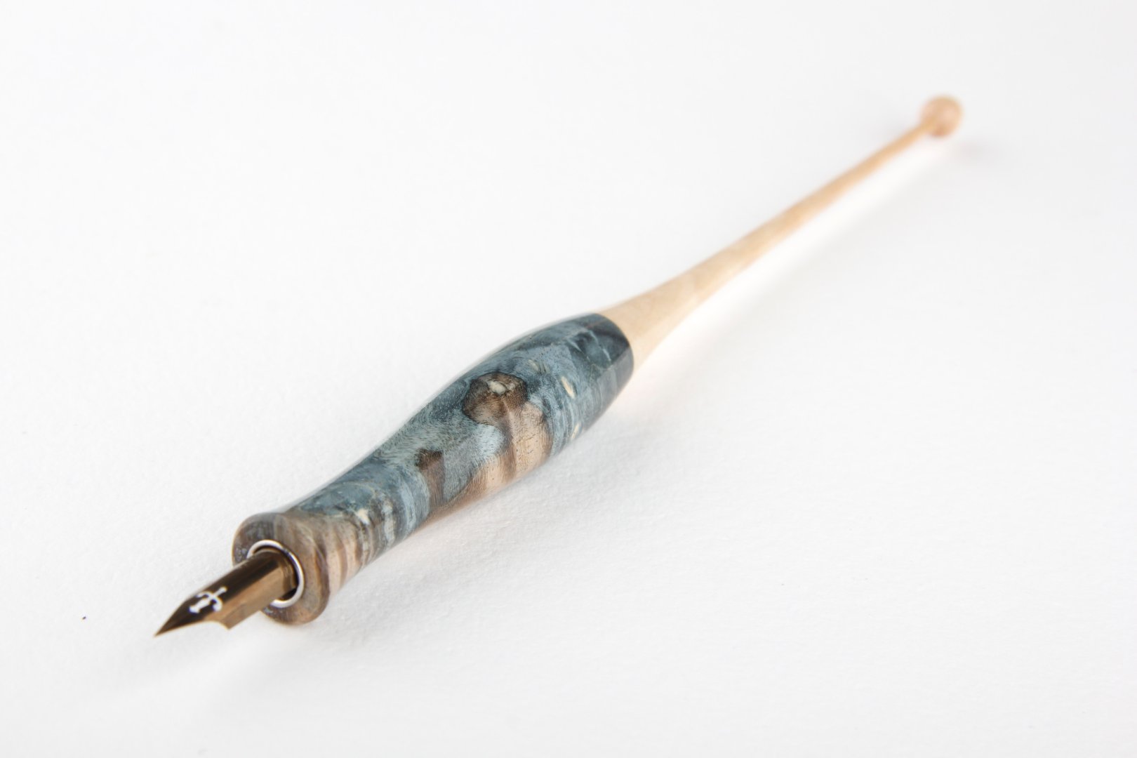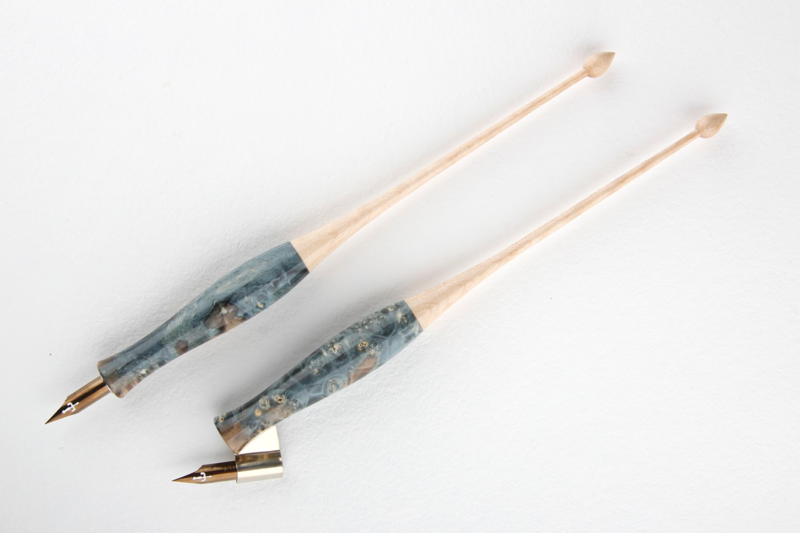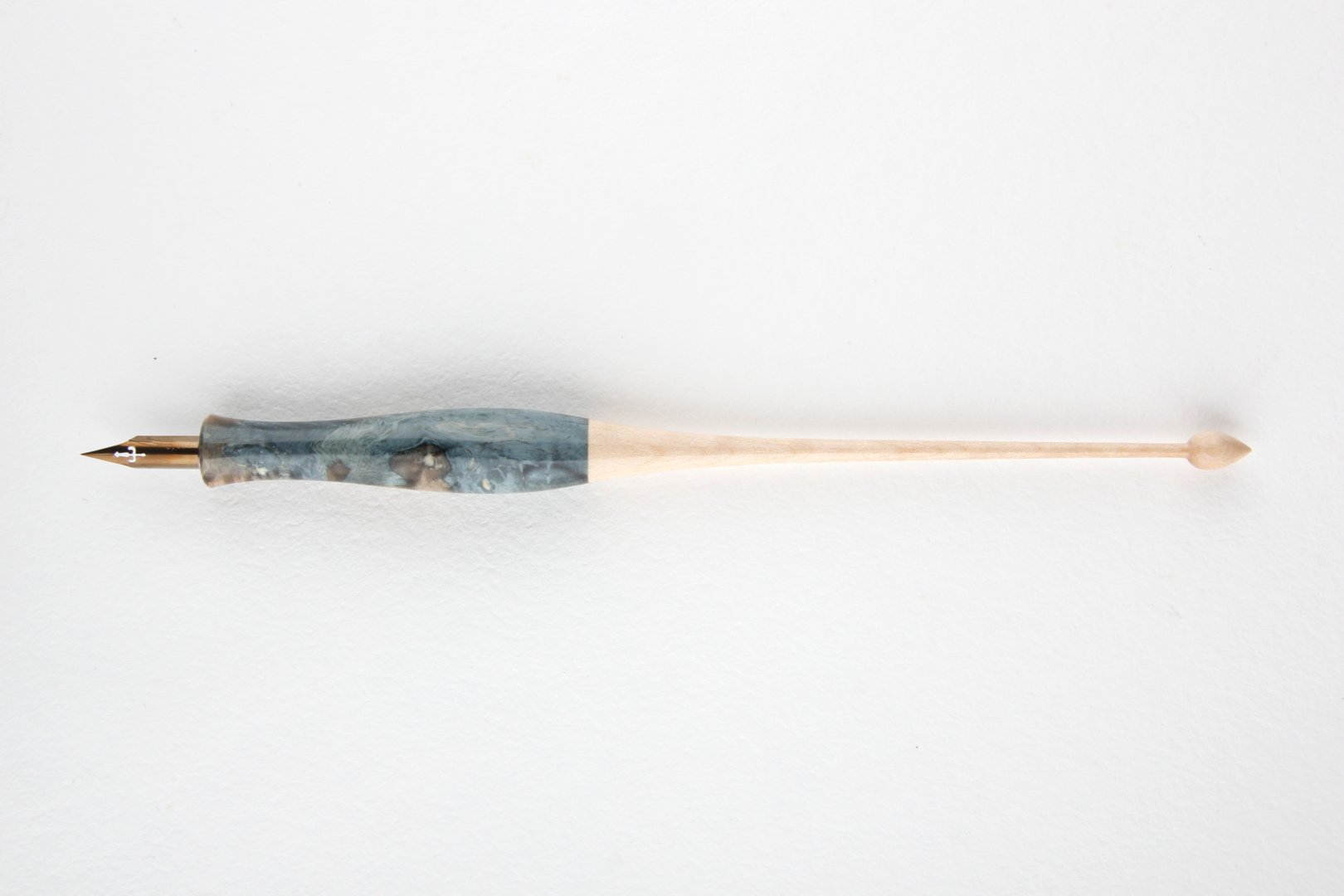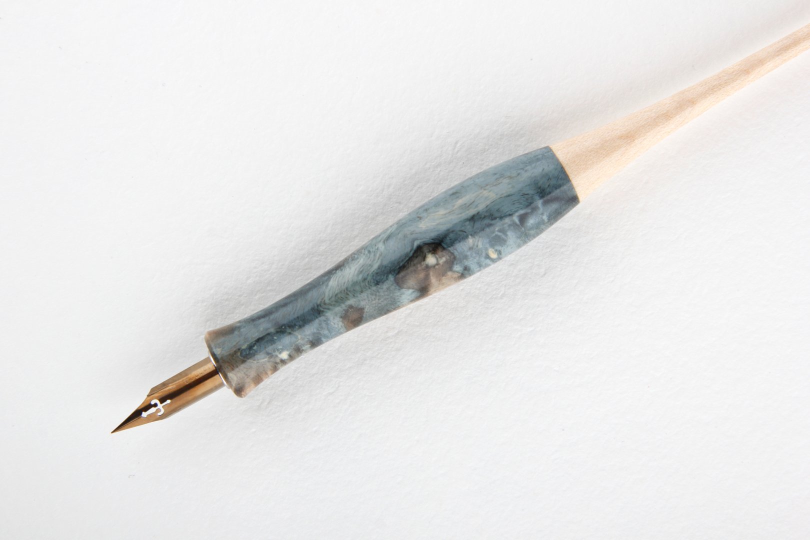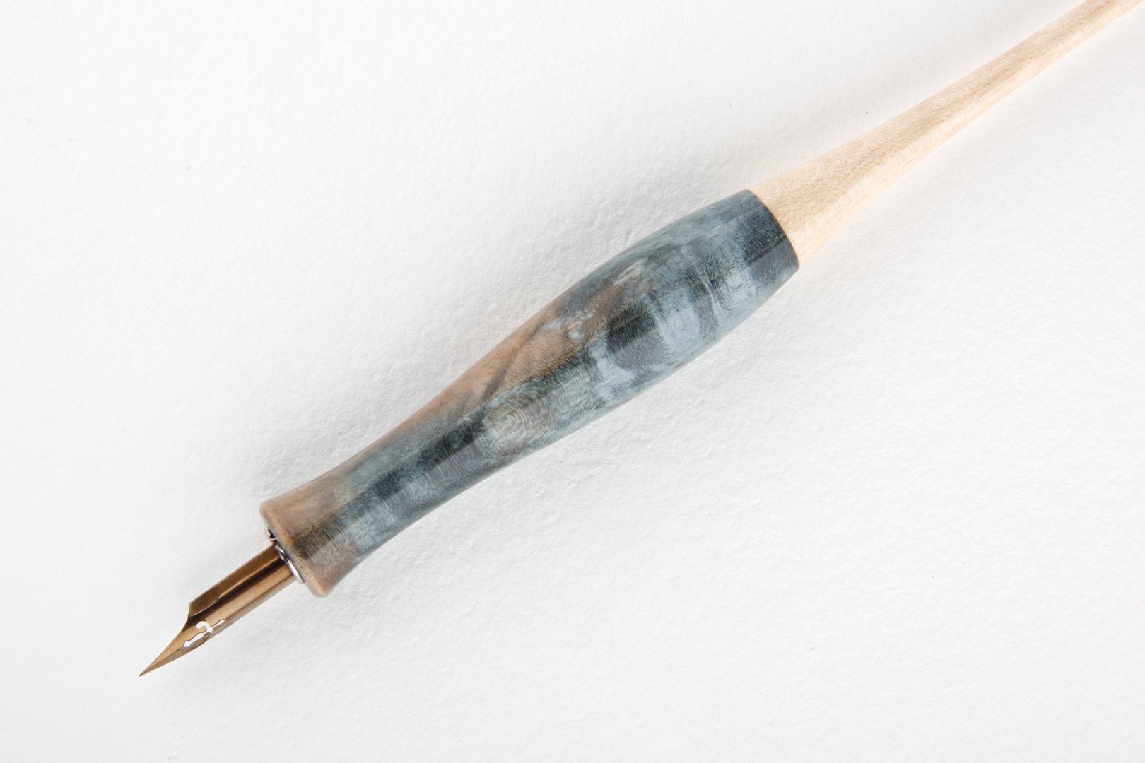 Straight pen holder made of stabilized maple burl and curly maple wood. Finished with 10 layers clear coat polished to a high gloss.